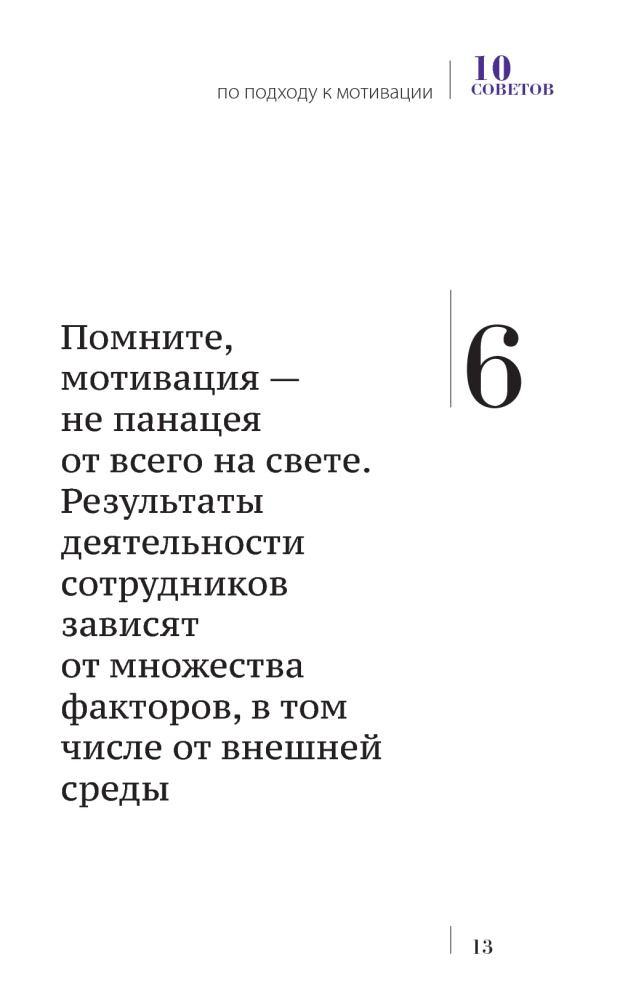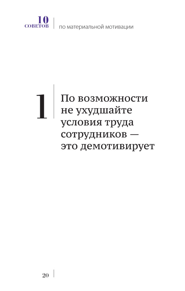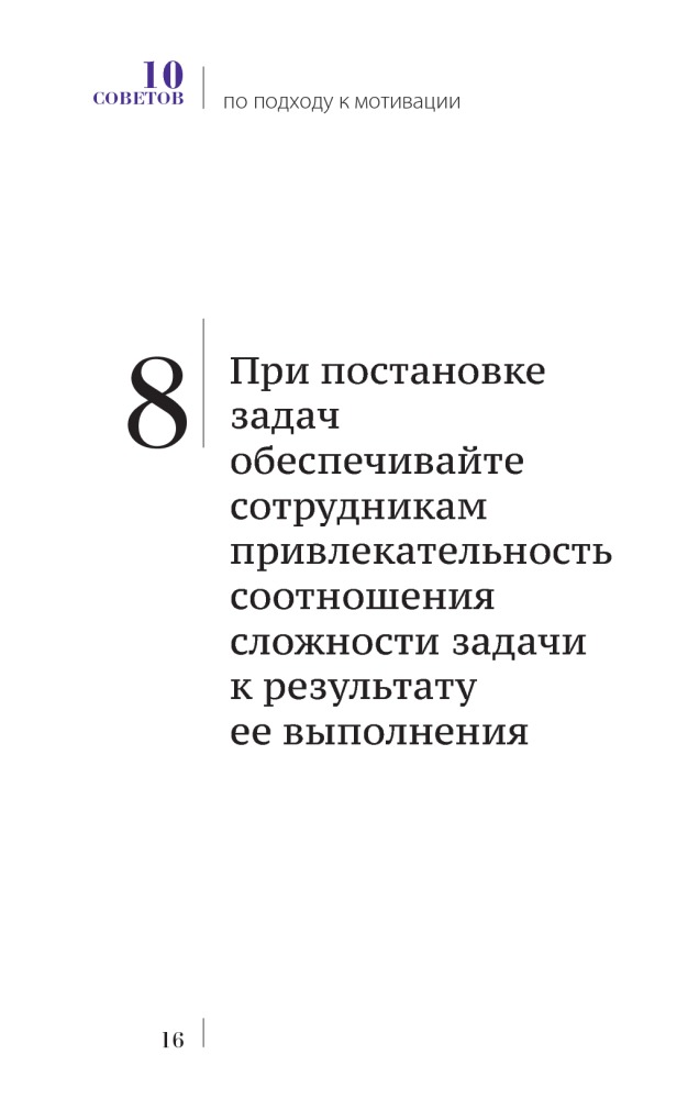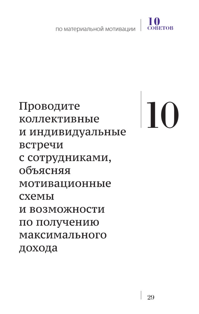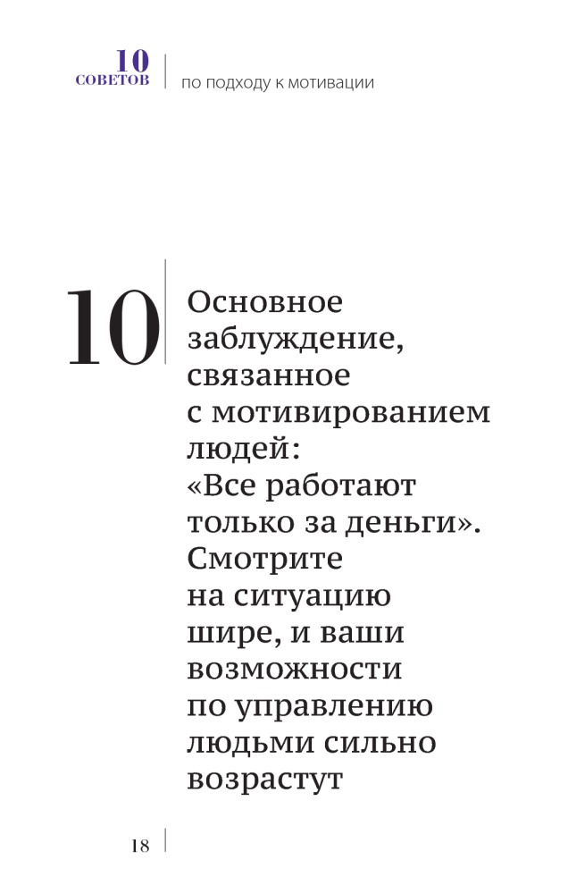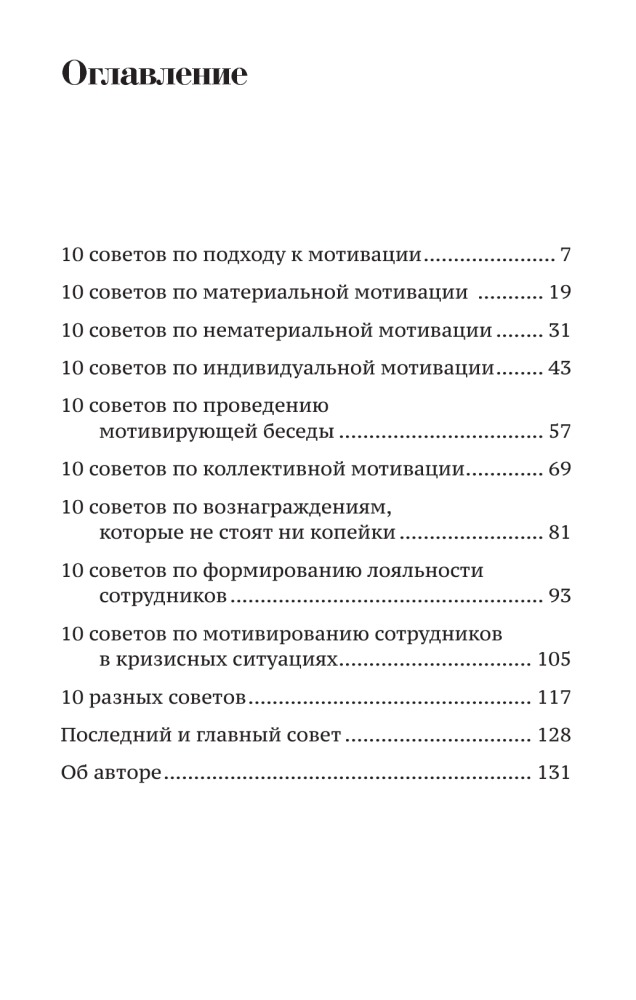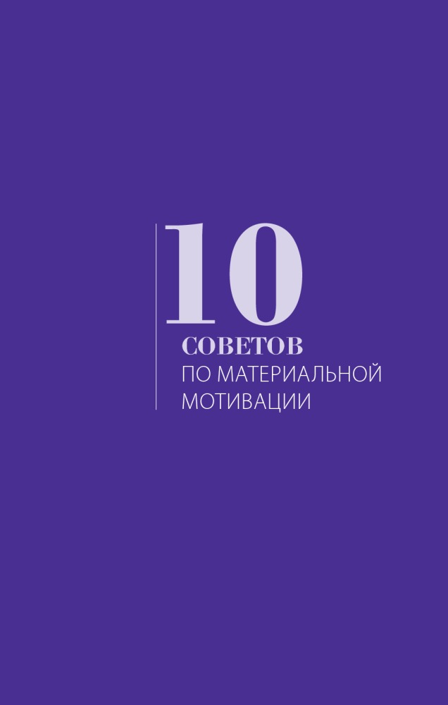 • В ней читатель найдет 101 эффективный совет по подходу к мотивации, в том числе по материальной и нематериальной мотивации, по индивидуальной и коллективной мотивации, по проведению мотивирующей беседы, по формированию лояльности сотрудников, по мотивированию сотрудников в кризисных ситуациях, а также о вознаграждениях, которые не стоят ни копейки.