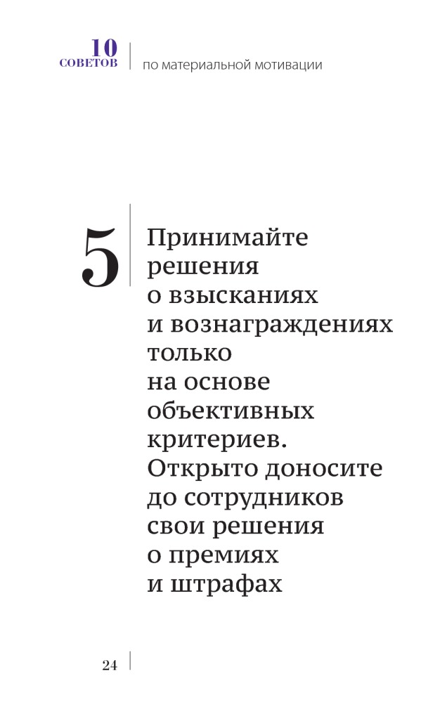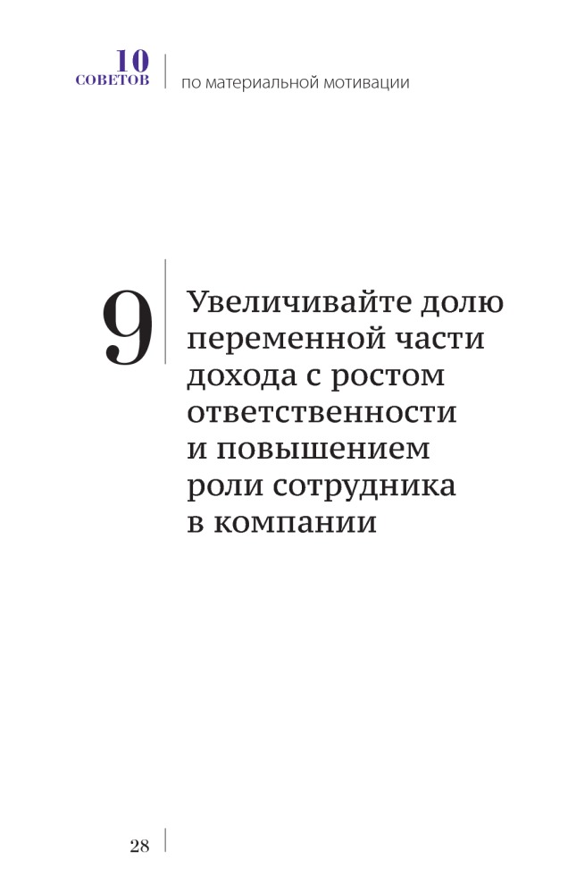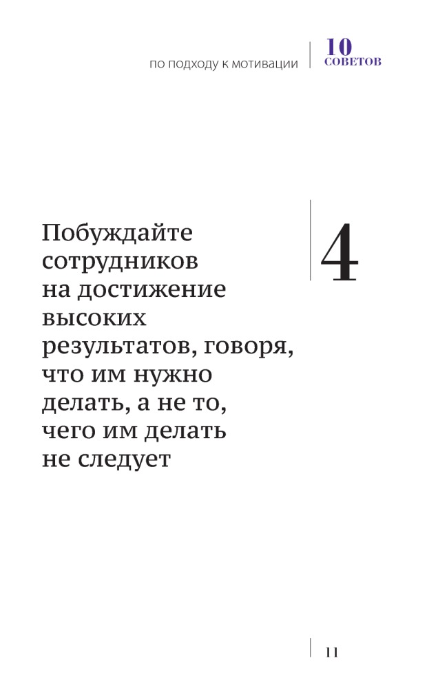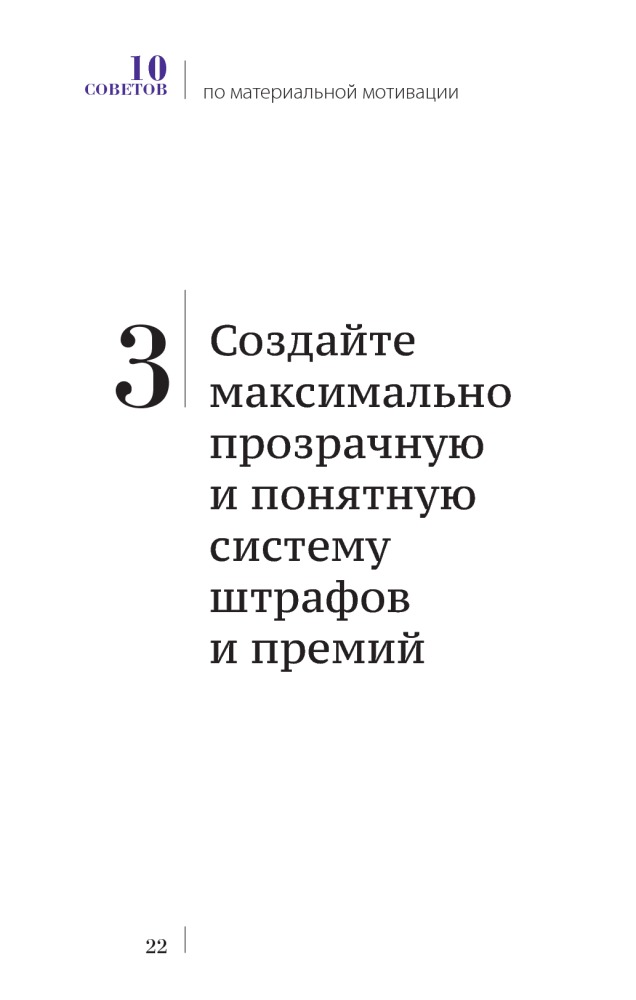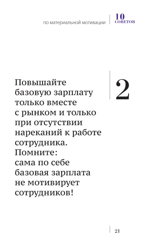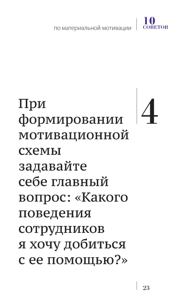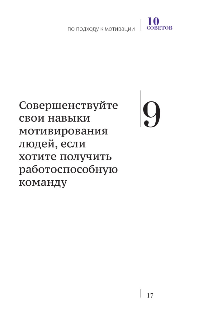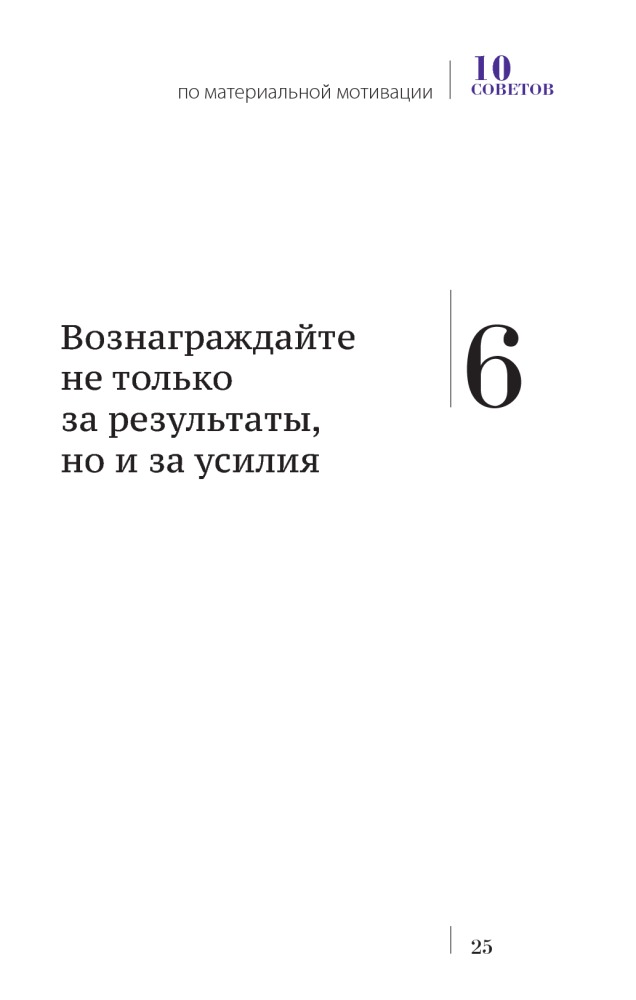 • В ней читатель найдет 101 эффективный совет по подходу к мотивации, в том числе по материальной и нематериальной мотивации, по индивидуальной и коллективной мотивации, по проведению мотивирующей беседы, по формированию лояльности сотрудников, по мотивированию сотрудников в кризисных ситуациях, а также о вознаграждениях, которые не стоят ни копейки.