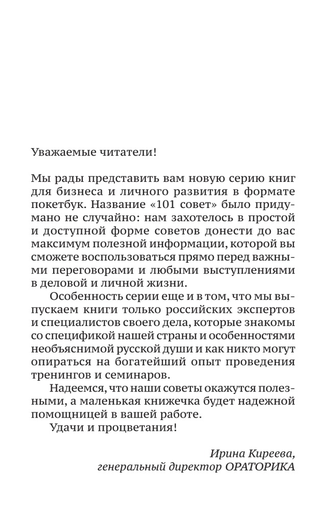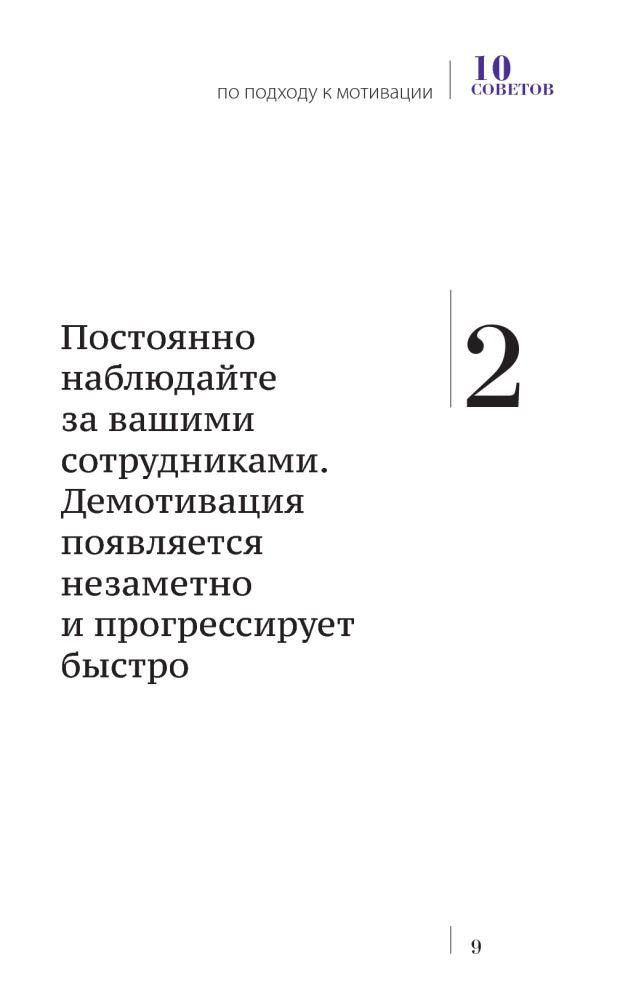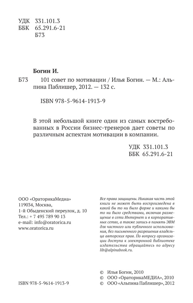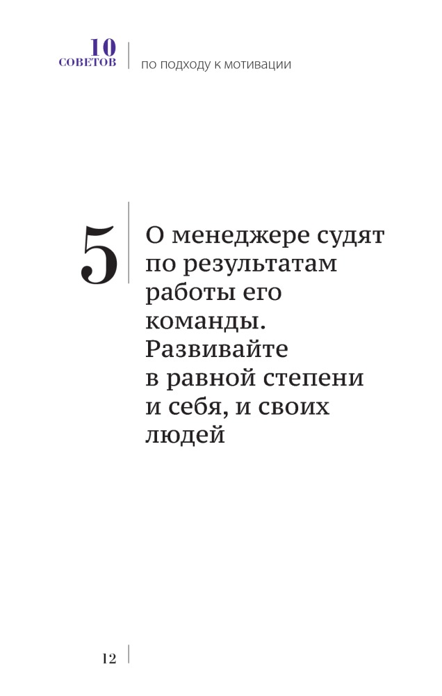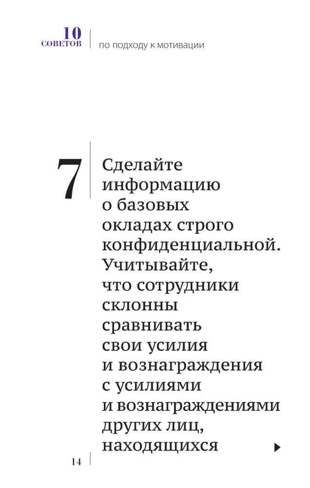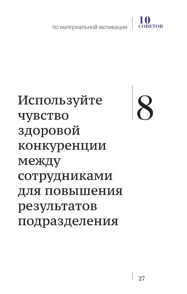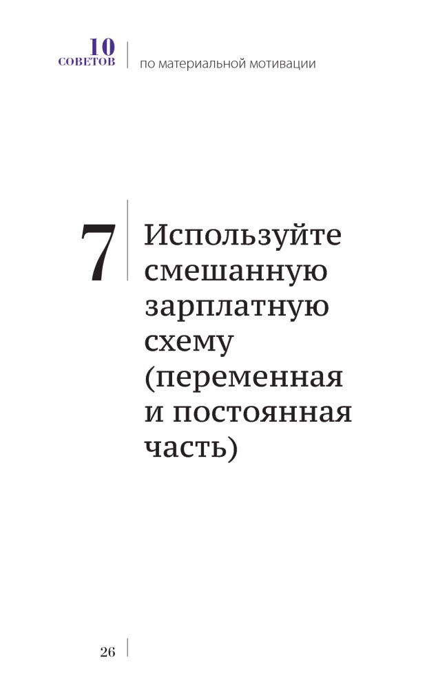 • В ней читатель найдет 101 эффективный совет по подходу к мотивации, в том числе по материальной и нематериальной мотивации, по индивидуальной и коллективной мотивации, по проведению мотивирующей беседы, по формированию лояльности сотрудников, по мотивированию сотрудников в кризисных ситуациях, а также о вознаграждениях, которые не стоят ни копейки.