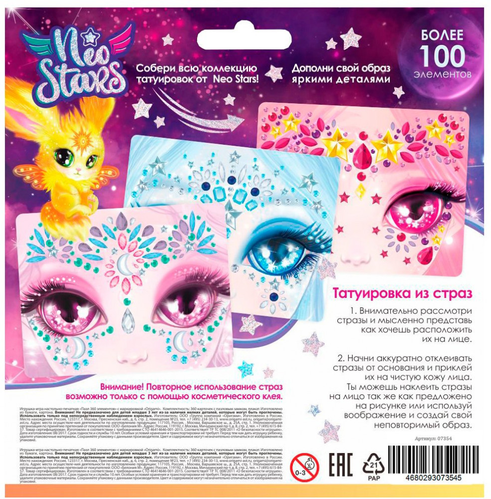 Origami Стразы для лица «Солнце»В данный момент этот товар отсутствует в продаже. Возможно, у нас найдется аналогичный или похожий товар здесь. Серия: Neo Stars Набор для творчества в космическом дизайне Neo Stars понравится любой девочке! Более 100 самоклеящихся страз разного размера помогут создать много ярких образов для праздника или фотосессии. Стразы имеют липкий слой, с помощью которого держатся на коже лица, не повреждая и не травмируя её. В качестве вдохновения вы можете использовать рисунок с упаковки или создать свой неповторимый образ! В набор входят самоклеящиеся стразы разного размера — более 100 штук. |