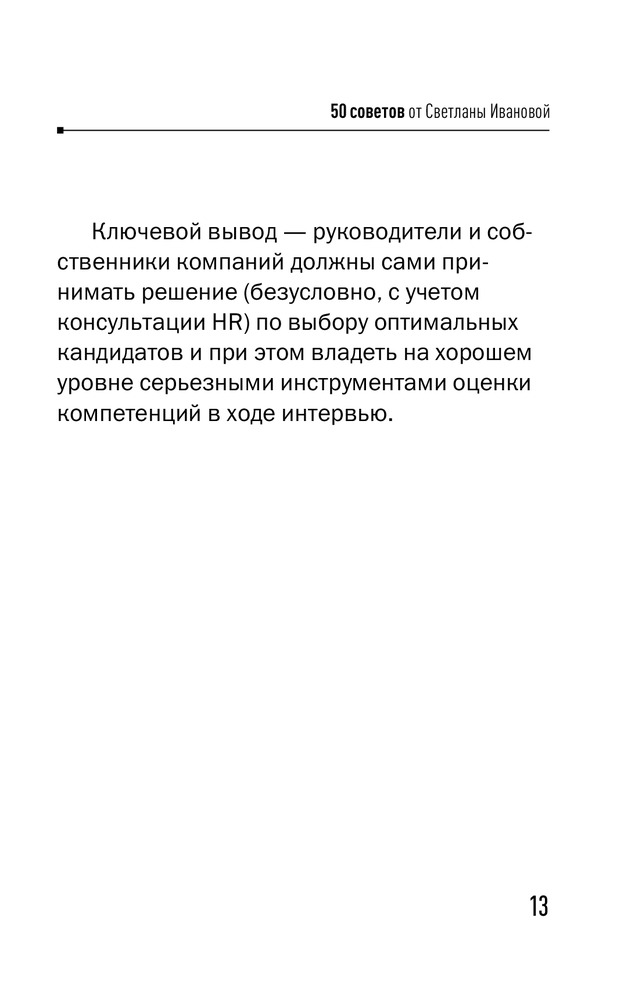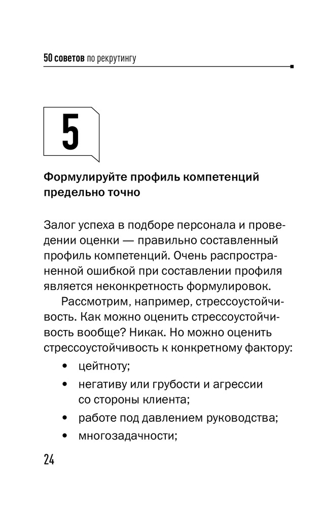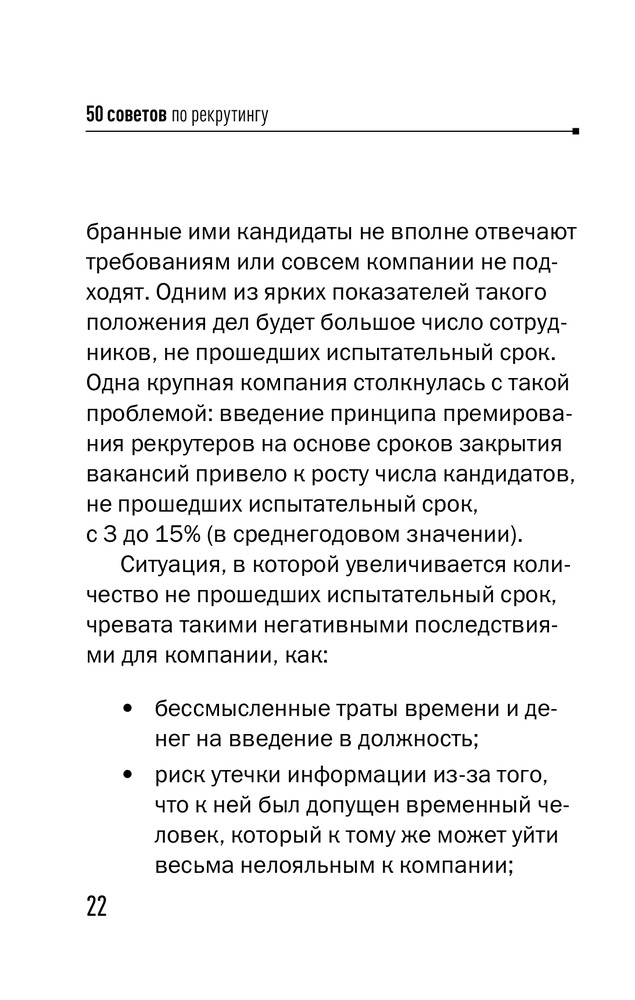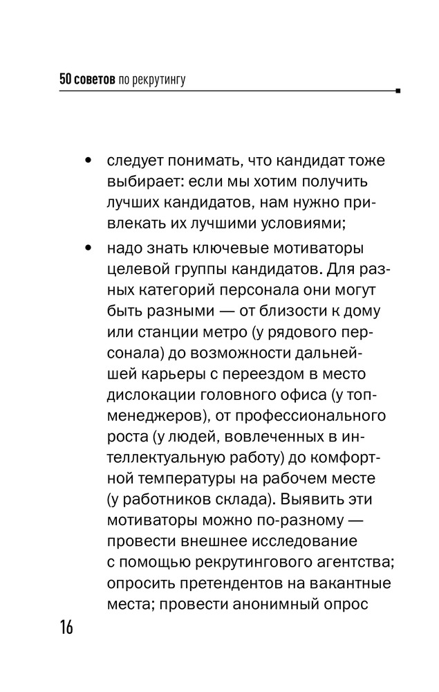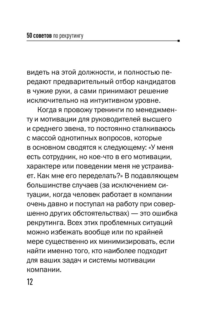 50 советов по рекрутингуВ данный момент этот товар отсутствует в продаже. Возможно, у нас найдется аналогичный или похожий товар здесь. Серия: Менеджмент В какой еще стране вы найдете столько самобытных компаний, оригинальных собственников, многообразие, а возможно, и столкновение различных культур, кроме России? Именно этот факт приводит к очень высокой вероятности ошибки в выборе кандидата при условии, что оценка будет базироваться в основном на анализе его прошлого опыта и успешности. |