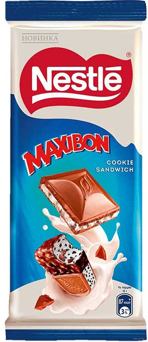 Nestle Шоколад молочный «Maxibon»В данный момент этот товар отсутствует в продаже. Возможно, у нас найдется аналогичный или похожий товар здесь. Новинка от бренда Nestle — восхитительный вкус мороженного Maxibon в шоколадной плитке! Nestle Maxibon — это двухслойная начинка и хрустящее печенье в каждой дольке. Каждая порция дарит необычное сочетание нежной молочной и шоколадной начинки. |