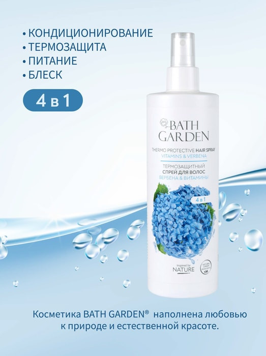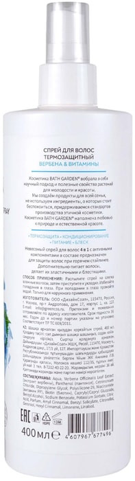 Bath garden Спрей для волос термозащитный «Вербена & витамины»В данный момент этот товар отсутствует в продаже. Возможно, у нас найдется аналогичный или похожий товар здесь. Невесомый спрей для волос 4 в 1 с активными компонентами в составе предназначен для термозащиты волос при горячем стайлинге. Дополнительно питает волосы, делает их эластичными и блестящими. |