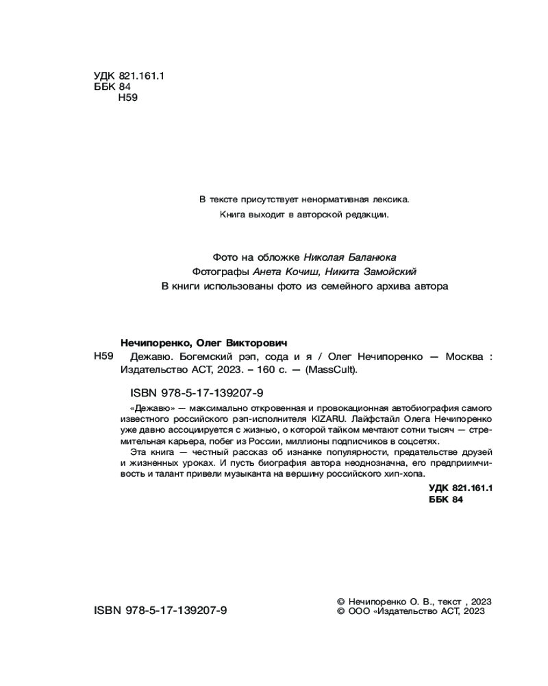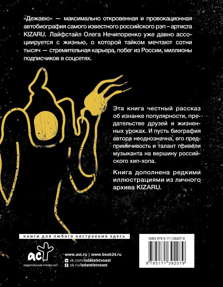 Дежавю. Богемский рэп, сода и яВ данный момент этот товар отсутствует в продаже. Возможно, у нас найдется аналогичный или похожий товар здесь. Серия: MassCult «Дежавю» — максимально откровенная и провокационная автобиография самого известного российского рэп-артиста KIZARU. Лайфстайл Олега Нечипоренко уже давно ассоциируется с жизнью, о которой тайком мечтают сотни тысяч — стремительная карьера, побег из России, миллионы подписчиков в соцсетях. |