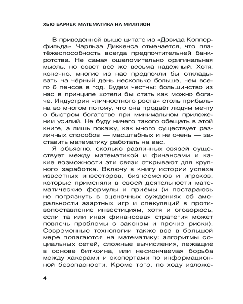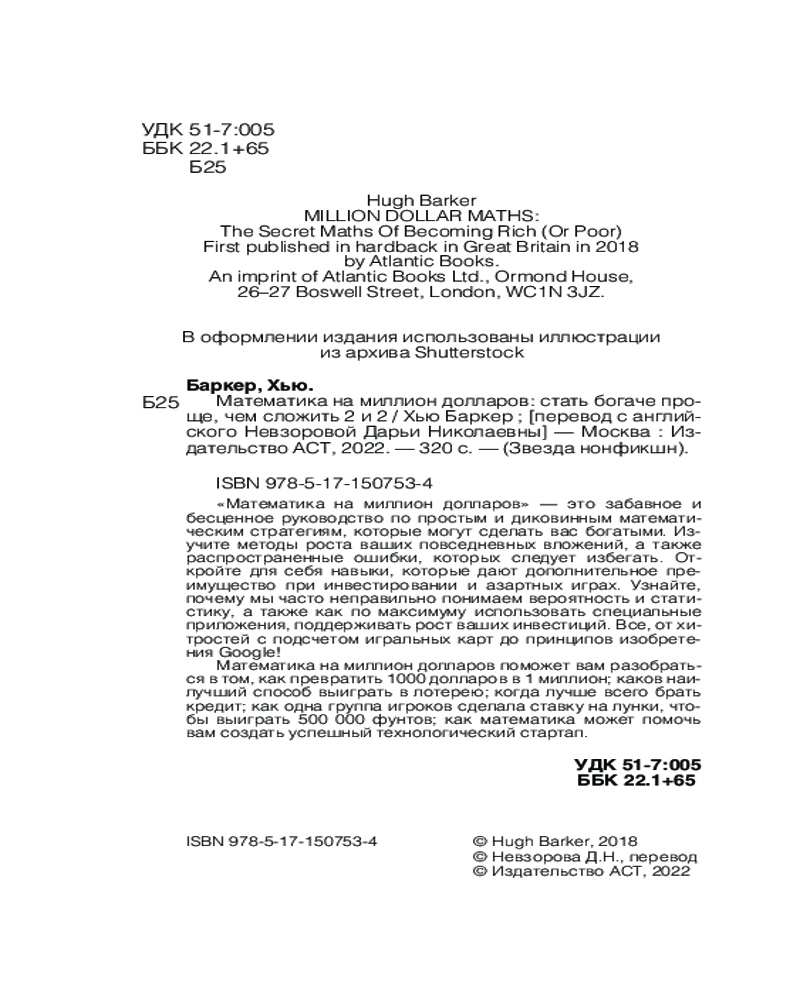 Математика на миллион долларовВ данный момент этот товар отсутствует в продаже. Возможно, у нас найдется аналогичный или похожий товар здесь. Серия: Звезда нонфикшн «Математика на миллион долларов» — это забавное и бесценное руководство по простым и диковинным математическим стратегиям, которые могут сделать вас богатыми. Изучите методы роста ваших повседневных вложений, а также распространенные ошибки, которых следует избегать. Откройте для себя навыки, которые дают дополнительное преимущество при инвестировании и азартных играх. Узнайте, почему мы часто неправильно понимаем вероятность и статистику, а также как по максимуму использовать специальные приложения, поддерживать рост ваших инвестиций. Все, от хитростей с подсчетом игральных карт до принципов изобретения Google! |