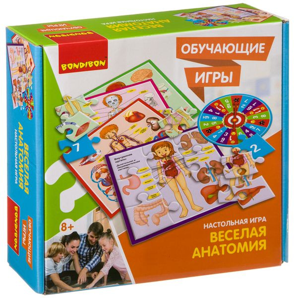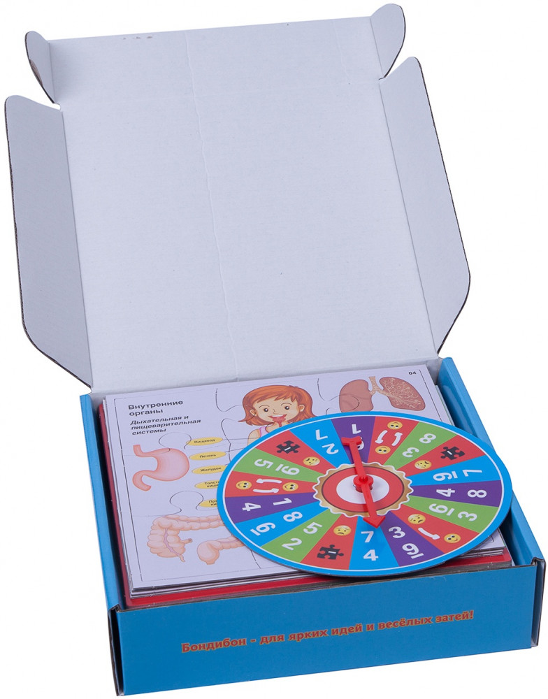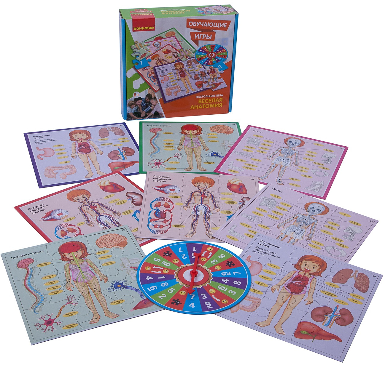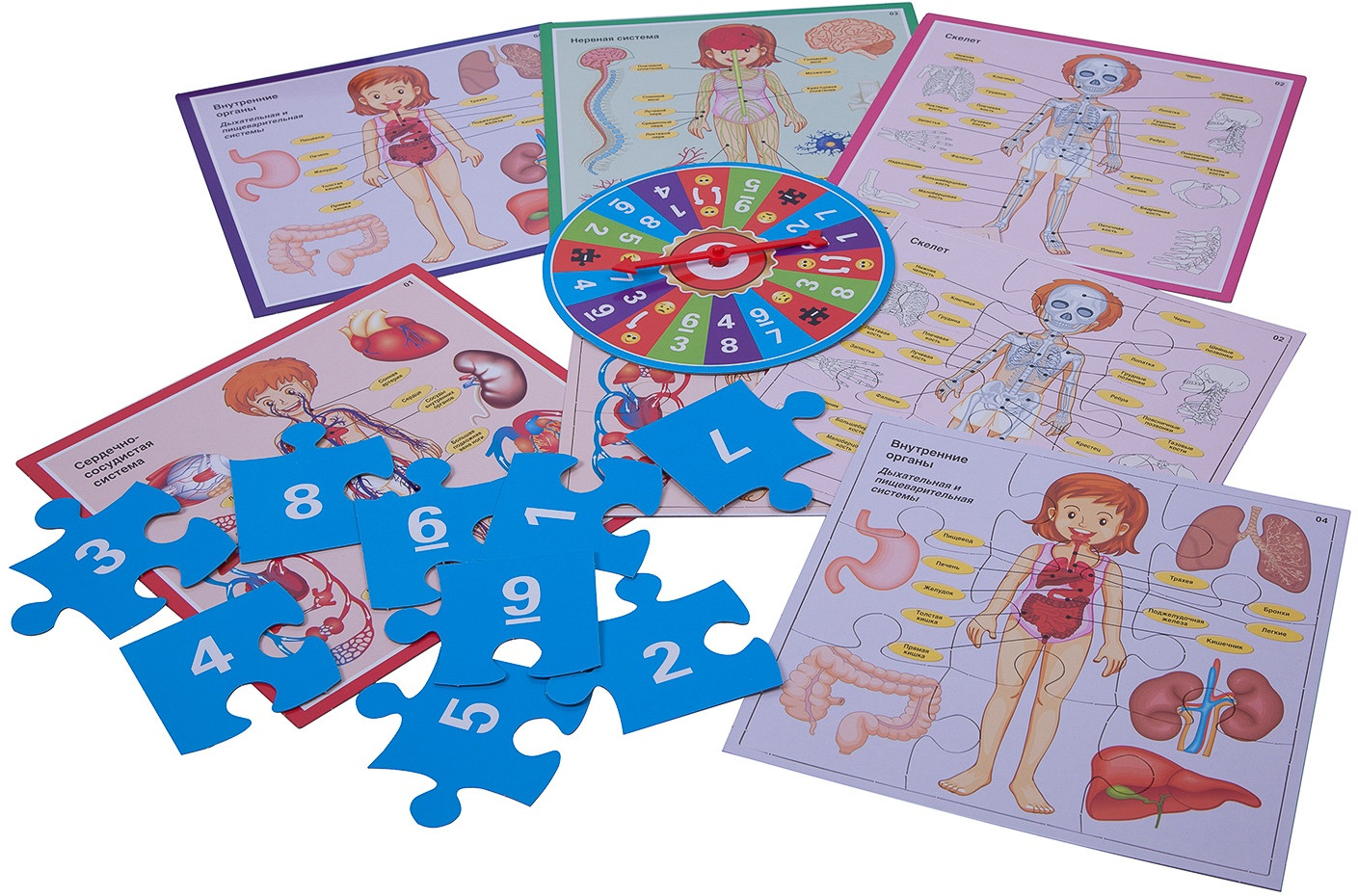 Веселая анатомия — отличный способ провести первое знакомство ребенка со строением человеческого организма. Перед началом игры каждый игрок выбирает одну из 4 анатомических схем. Разложите все пазлы в центре стола цифрами вверх.