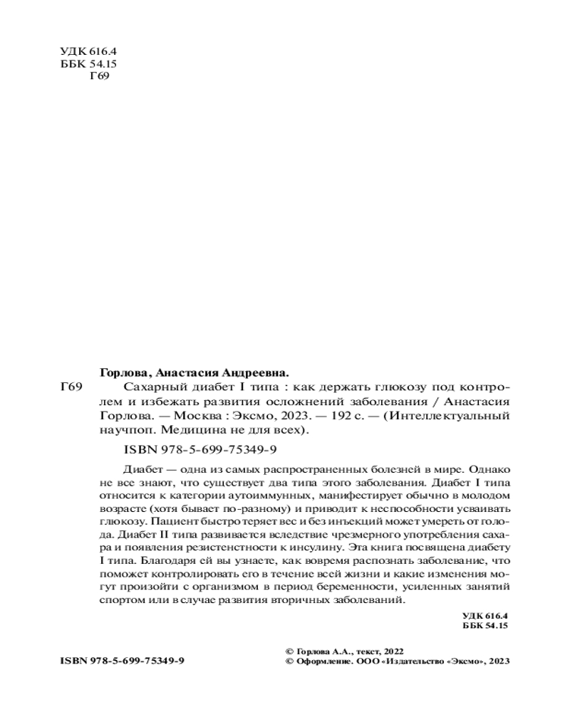 Сахарный диабет I типа. Как держать глюкозу под контролем и избежать развития осложнений заболеванияВ данный момент этот товар отсутствует в продаже. Возможно, у нас найдется аналогичный или похожий товар здесь. Серия: Интеллектуальный научпоп. Медицина не для всех Эта книга станет удобным настольным инструментом как для людей с сахарным диабетом, так и для тех, кто заботится о здоровье своих родных и близких. Она поможет вам понять, что такое сахарный диабет I типа, как легко контролировать уровень глюкозы в крови и избежать развития осложнений. Вы поймете все процессы заболевания и при этом не будете загружены медицинскими терминами и понятиями. С этой книгой вы научитесь простым алгоритмам и принципам контроля сахарного диабета. |