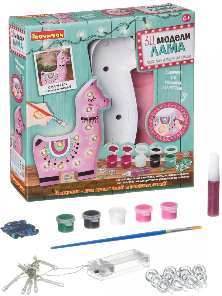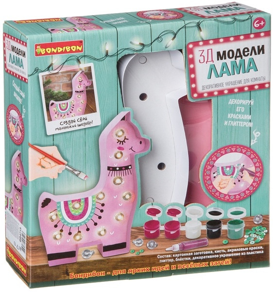 Создайте необычный аксессуар для комнаты — 3D модель прелестной ламы! Раскрасьте модель красками, украсьте глиттерами и светящимися в темноте украшениями!
