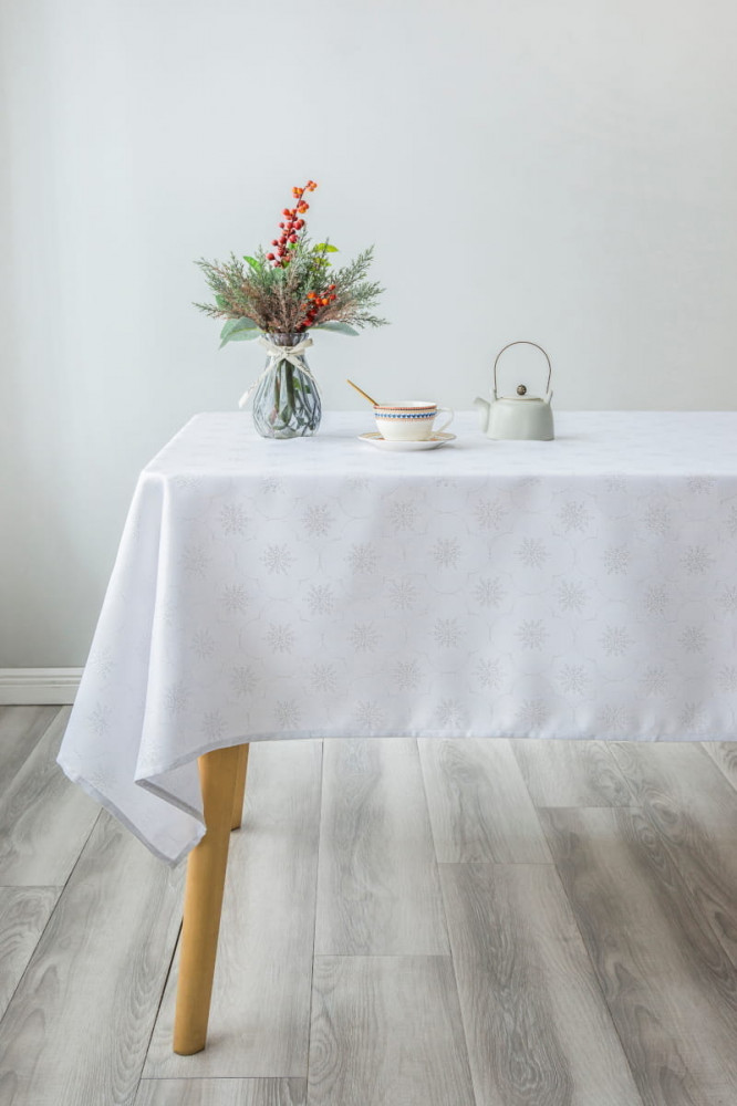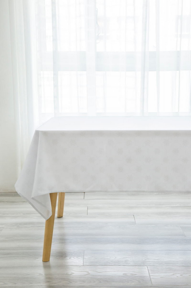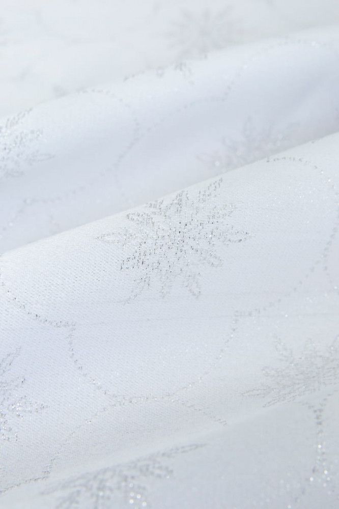 Красивая нарядная скатерть! Белоснежная с серебристыми нитями, все как на фото. Немного тонкая и легкая, поэтому скатывается со стола. Но за такую цену просто красота!