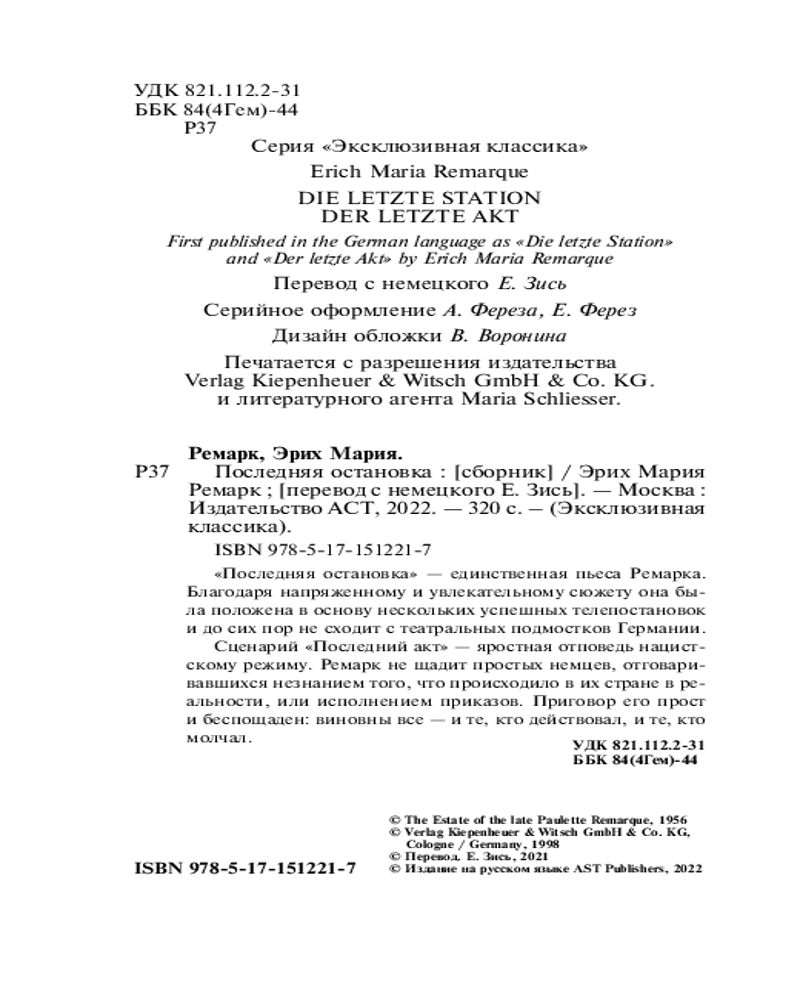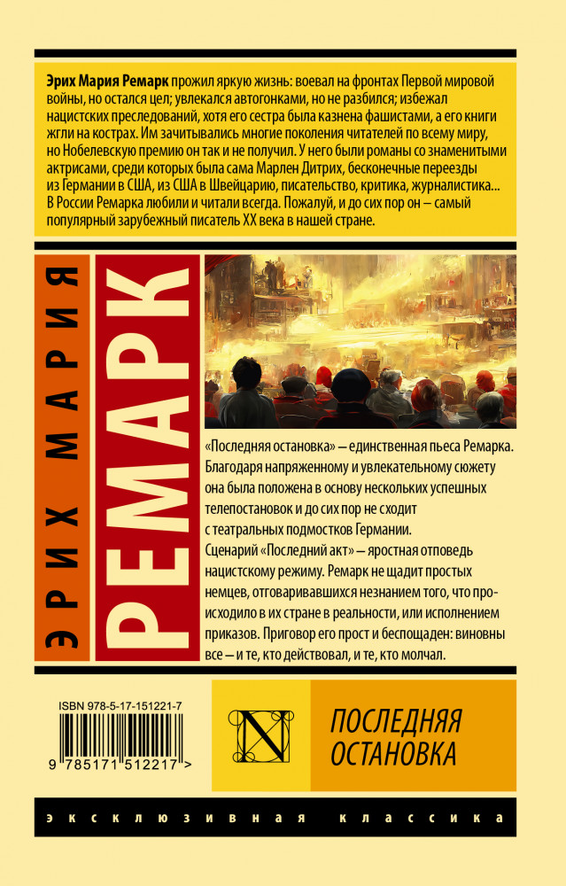 💳 Оплатить за товар можно при получении 🇰🇿 Есть бесплатная доставка по Казахстану от 1 дня 🎁 Копите бонусы с каждой покупки Серия: Эксклюзивная классика «Последняя остановка» — единственная пьеса Ремарка. Благодаря напряженному и увлекательному сюжету она была положена в основу нескольких успешных телепостановок и до сих пор не сходит с театральных подмостков Германии. |