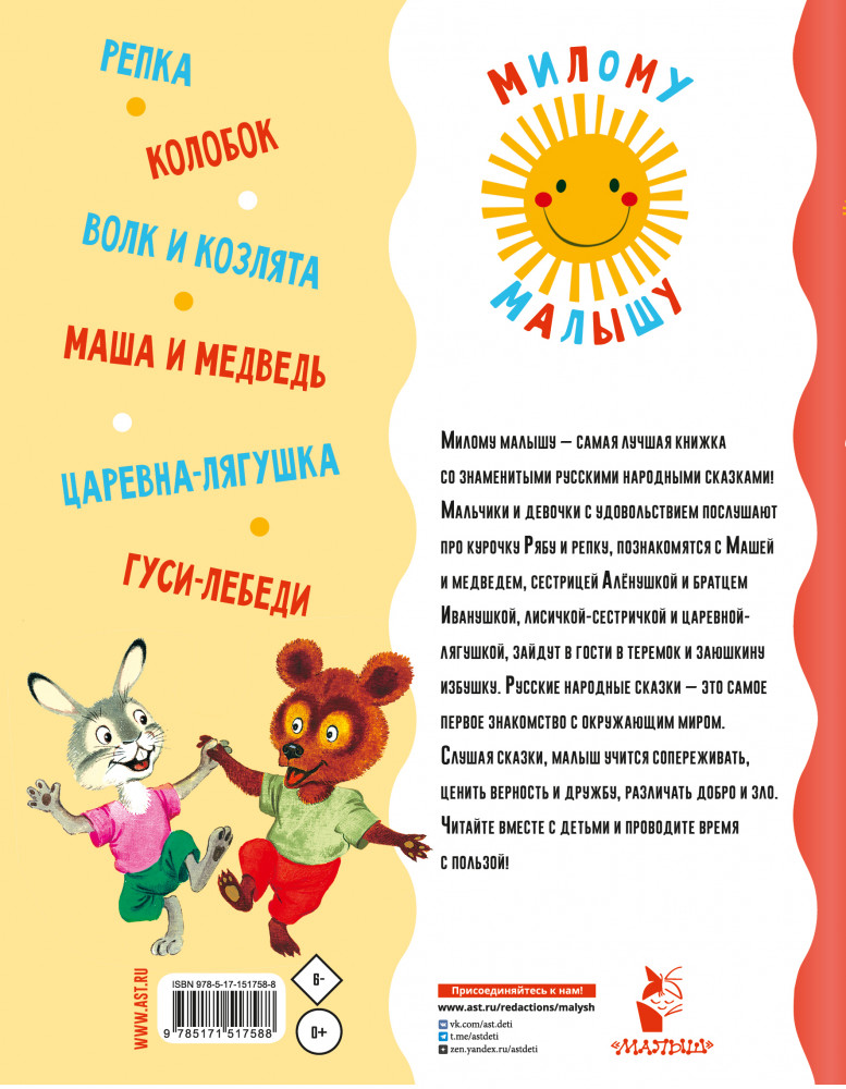 💳 Оплатить за товар можно при получении 🇰🇿 Есть бесплатная доставка по Казахстану от 1 дня 🎁 Копите бонусы с каждой покупки Серия: Милому малышу В книгу «Русские народные сказки» вошли самые знаменитые народные сказки для малышей в классических обработках и пересказах А.Н. Афанасьева, К.Д. Ушинского, А.Н. Толстого и других знатоков русского быта и традиций. Рассматривая большие, цветные, наглядные картинки и слушая сказки, малыши развивают речь, учатся отличать добро от зла, получают первое представление об окружающем мире и знакомятся с курочкой Рябой, лисичкой со скалочкой, Машей и медведем и другими известными героями. |