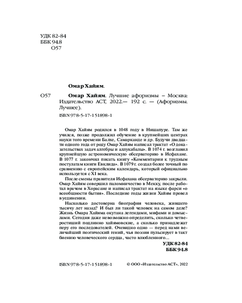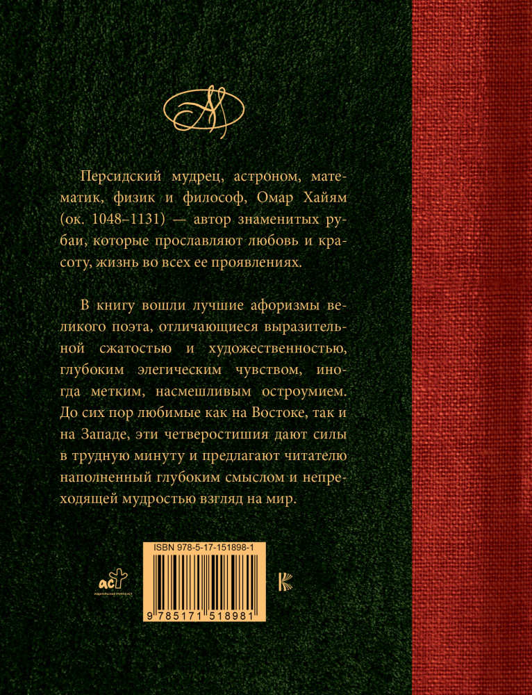 💳 Оплатить за товар можно при получении 🇰🇿 Есть бесплатная доставка по Казахстану от 1 дня 🎁 Копите бонусы с каждой покупки Серия: Афоризмы. Лучшее Персидский мудрец, астроном, математик, физик и философ, Омар Хайям (ок. 1048-1131) — автор знаменитых рубаи, которые прославляют любовь и красоту, жизнь во всех ее проявлениях. В книгу вошли лучшие афоризмы великого поэта в классических переводах, отличающиеся выразительной сжатостью и художественностью, глубоким элегическим чувством, иногда метким, насмешливым остроумием. До сих пор любимые как на Востоке, так и на Западе, эти четверостишия дают силы в трудную минуту и предлагают читателю наполненный глубоким смыслом и непреходящей мудростью взгляд на мир. |