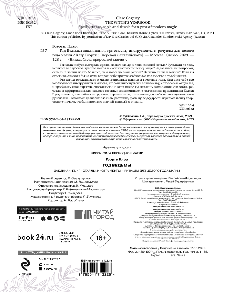 💳 Оплатить за товар можно при получении 🇰🇿 Есть бесплатная доставка по Казахстану от 1 дня 🎁 Копите бонусы с каждой покупки Серия: Викка. Сила природной магии Это книга о том, как прожить целый год, наполненный магией, в соответствии с природными ритмами! Следите за сменой времен года, отмечайте праздники Колеса года и оттачивайте свое магическое искусство, становясь сильнее и увереннее в себе. Книга «Год Ведьмы» Клэр Доэрти даст вам все необходимые инструменты и знания, чтобы прикоснуться к волшебству, которое разлито вокруг нас, и пробудить свои скрытые способности. |