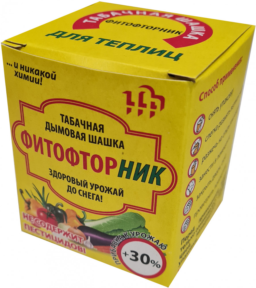 Шашка для теплиц табачнаяВ данный момент этот товар отсутствует в продаже. Возможно, у нас найдется аналогичный или похожий товар здесь. Табачные дымовые шашки предназначены для обработки теплиц, парников, оранжерей в период вегетации от таких вредителей как: тля, медяница, листовертка, белокрылка, яблонная и плодовая моль, трипсы и другие сосущие насекомые. «Фитофторник» убивает болезнетворные грибы и подавляет их распространение, что помогает бороться с грибковыми заболеваниями, такими как: фитофтороз, бурая пятнистость, серая гниль, мучнистая роса, кладоспориоз и др. грибковые болезни |