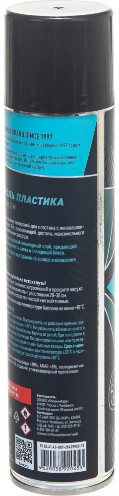 💳 Оплатить за товар можно при получении 🇰🇿 Есть бесплатная доставка по Казахстану от 1 дня 🎁 Копите бонусы с каждой покупки Средство для ухода за изделиями и поверхностями из пластика и резины. Полироль пластика разработан на основе инновационной технологии Touch-Pro, которая позволяет достичь высочайшего результата при минимальном расходе. Состав с глянцевым финишем придает обновленный внешний вид и защищает от вредного воздействия УФ-лучей. Аэрозольный формат средства удобен в применении и имеет небольшой расход. |
