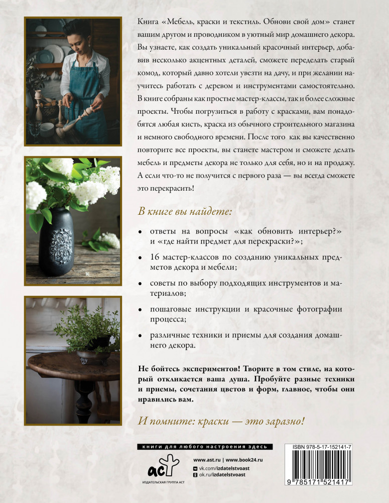 Мебель, краски и текстиль. Обнови свой домВ данный момент этот товар отсутствует в продаже. Возможно, у нас найдется аналогичный или похожий товар здесь. Серия: Секреты из мастерской Анита Носова — художник, дизайнер, автор популярного канала «Про краски», создатель одноименной онлайн-школы декора. |