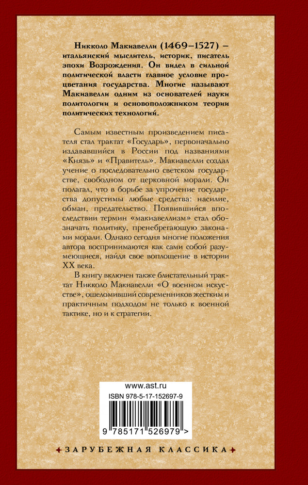 💳 Оплатить за товар можно при получении 🇰🇿 Есть бесплатная доставка по Казахстану от 1 дня 🎁 Копите бонусы с каждой покупки Серия: Зарубежная классика Самым известным произведением писателя стал трактат «Государь», первоначально издававшийся в России под названиями «Князь» и «Правитель». Макиавелли создал учение о последовательно светском государстве, свободном от церковной морали. Он полагал, что в борьбе за упрочение государства допустимы любые средства: насилие, обман, предательство. Появившийся впоследствии термин «макиавеллизм» стал обозначать политику, пренебрегающую законами морали. Однако сегодня многие положения автора воспринимаются как сами собой разумеющиеся, найдя свое воплощение в истории XX века. |
