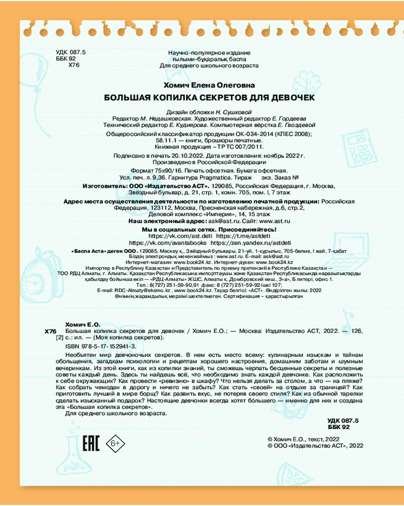 💳 Оплатить за товар можно при получении 🇰🇿 Есть бесплатная доставка по Казахстану от 1 дня 🎁 Копите бонусы с каждой покупки Серия: Моя копилка секретов Необъятен мир девчоночьих секретов. В нем есть место всему: кулинарным изыскам и тайнам обольщения, загадкам психологии и рецептам хорошего настроения, домашним заботам и шумным вечеринкам. Из |