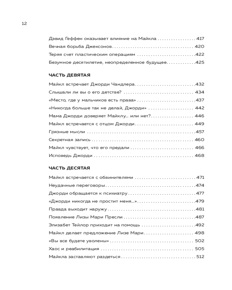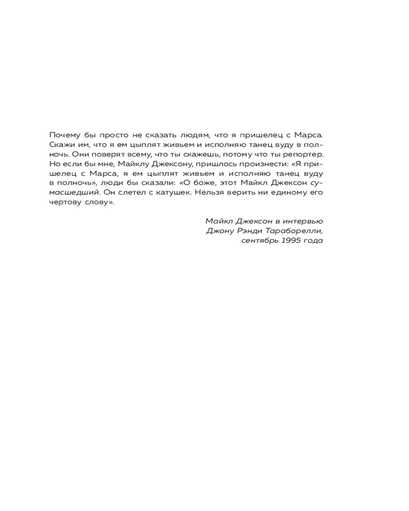 Эта книга — плод более чем 30-летнего исследования и сотен эксклюзивных интервью с самым близким кругом семьи Джексонов, включая самого Майкла при жизни. Продираясь сквозь все бульварные слухи и сплетни, автор стремится понять, каким человеком на самом деле была эта икона музыки. Книга включает в себя закулисную историю многих вех в жизни Джексона: его юридические и коммерческие баталии, его браки с Лизой Мари Пресли и Дебби Роу, его страсти и пристрастия, его дети, его безвременную смерть.