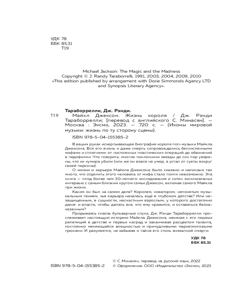 Серия: Иконы мировой музыки: жизнь по ту сторону сцены Исчерпывающая биография короля поп-музыки, безупречное исследование и блестящее повествование — уникальный подарок для настоящих ценителей творчества Майкла Джексона!
