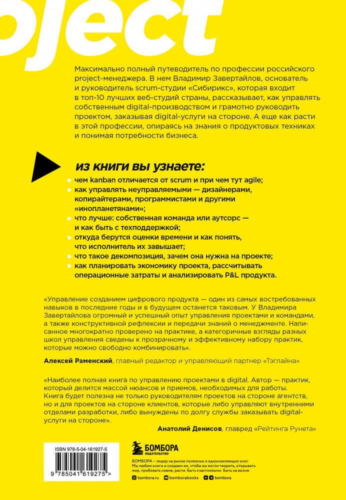 💳 Оплатить за товар можно при получении 🇰🇿 Есть бесплатная доставка по Казахстану от 1 дня 🎁 Копите бонусы с каждой покупки Серия: Top expert. Практичные книги для работы над собой Максимально полный путеводитель по профессии российского project-менеджера. В нем Владимир Завертайлов, основатель и руководитель scrum-студии «Сибирикс», которая входит в Топ-10 лучших веб-студий страны, рассказывает, как управлять собственным digital-производством и грамотно руководить проектом, заказывая digital-услуги на стороне. А еще — как расти в этой профессии, опираясь на знания о продуктовых техниках и понимая потребности бизнеса. |
