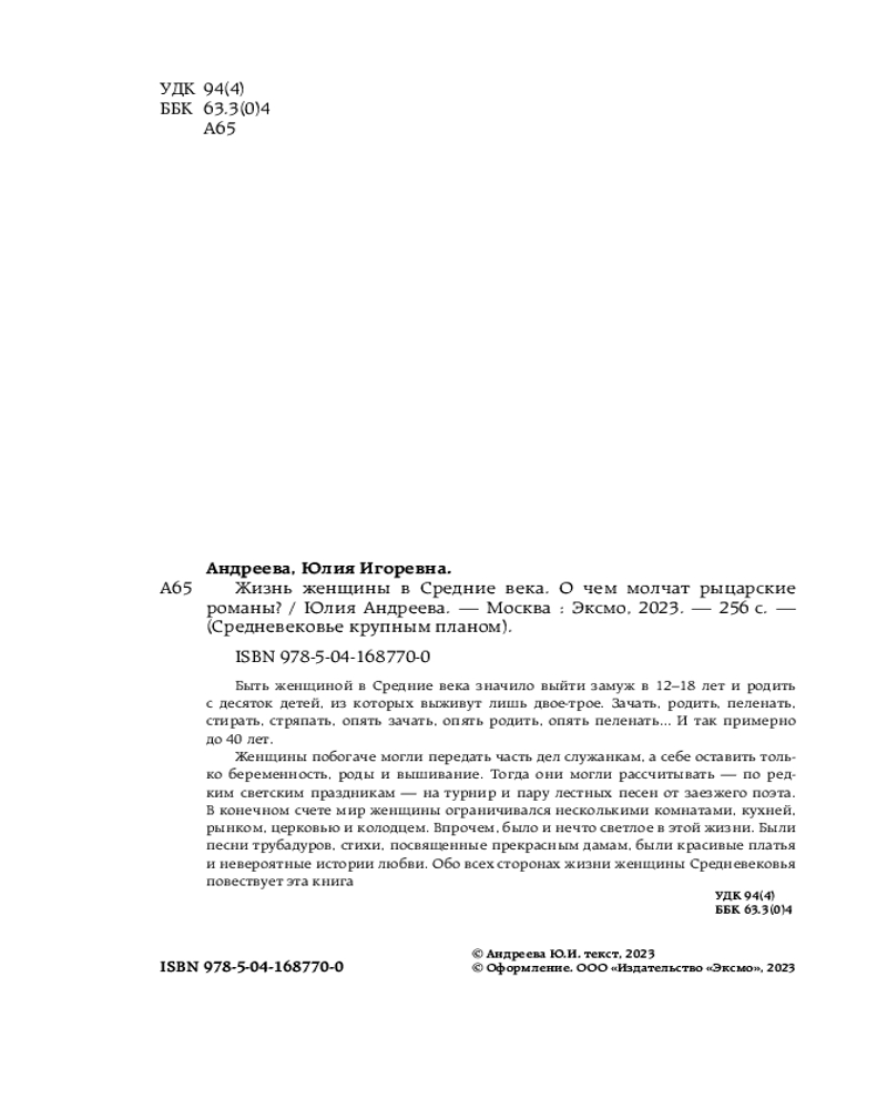 Писательница Юлия Андреева, автор более 40 исторических романов, приглашает вас в увлекательное и захватывающее путешествие по средневековым замкам и королевским покоям. А легкий слог автора позволит вам с головой погрузиться в мир королев и служанок, матерей и дочерей. Если вам интересны история средних веков, женская история, если вы с удовольствием прочитали «Средневековье крупным планом» О. Воскобойникова и «Страдающее Средневековье» — это книга для вас! |