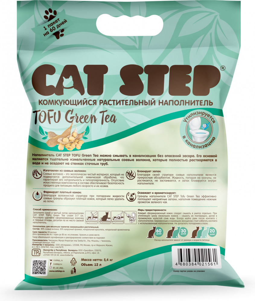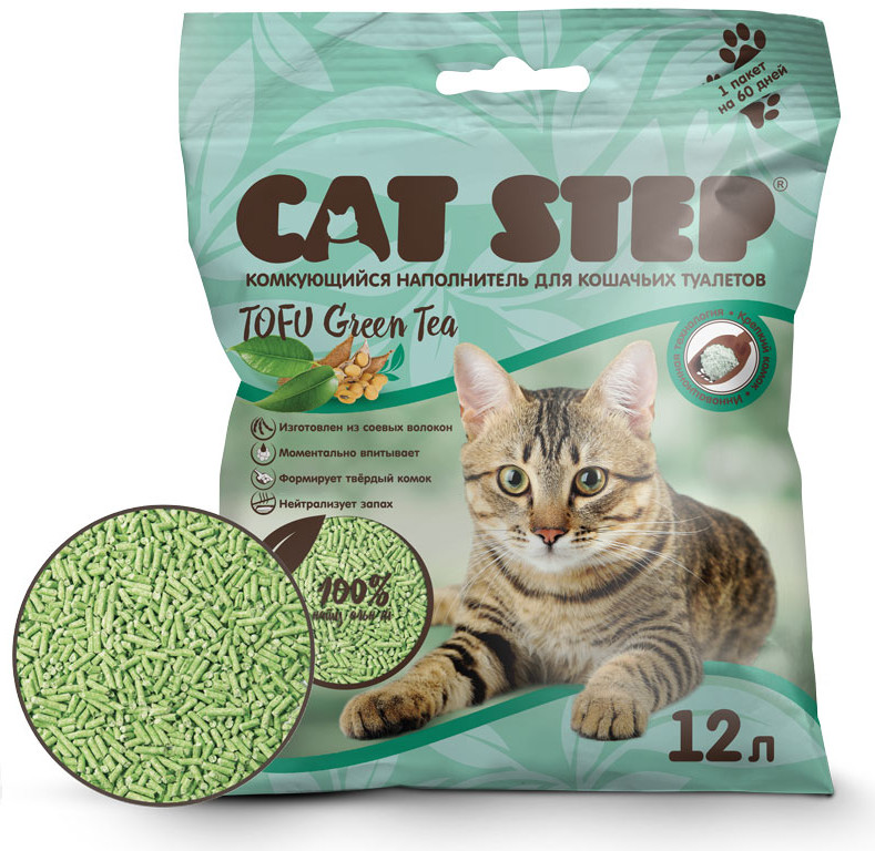 Cat Step Наполнитель для кошачьего туалета растительный комкующийся «Green Tea»