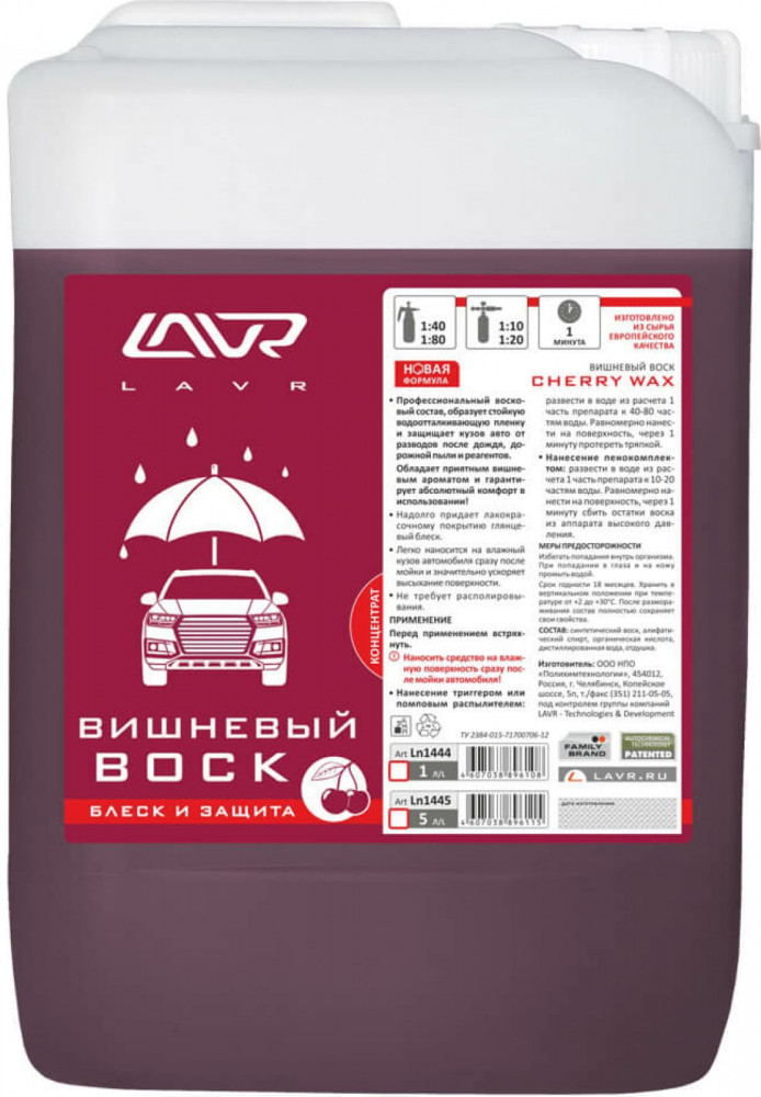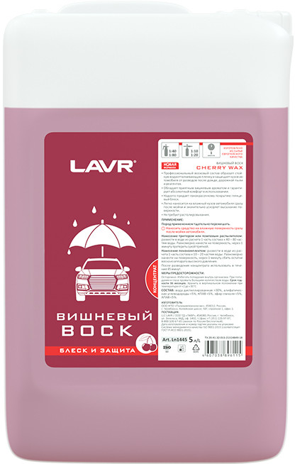 Вишневый воск Lavr — средство для обработки лакокрасочных поверхностей автомобилей и мотоциклов с целью придания им водоотталкивающих свойств. Комфортное нанесение и выраженный результат всего за несколько минут. Образует на поверхности устойчивую водоотталкивающую пленку и защищает кузов авто от разводов после дождя, дорожной пыли и реагентов.