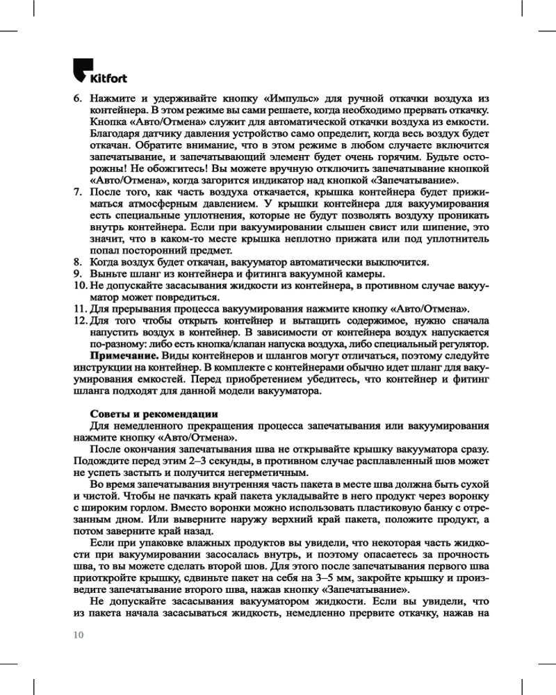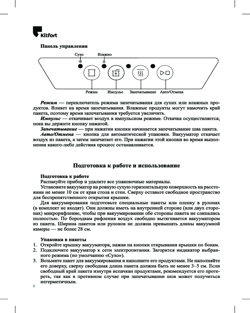 Авто — кнопка для автоматической упаковки: вакууматор откачает воздух из пакета, а затем запечатает его. Отдельный режим «Запечатывание» — запечатает пакет без предварительной откачки воздуха. «Откачка» — откачивает воздух без запечатывания пакета.