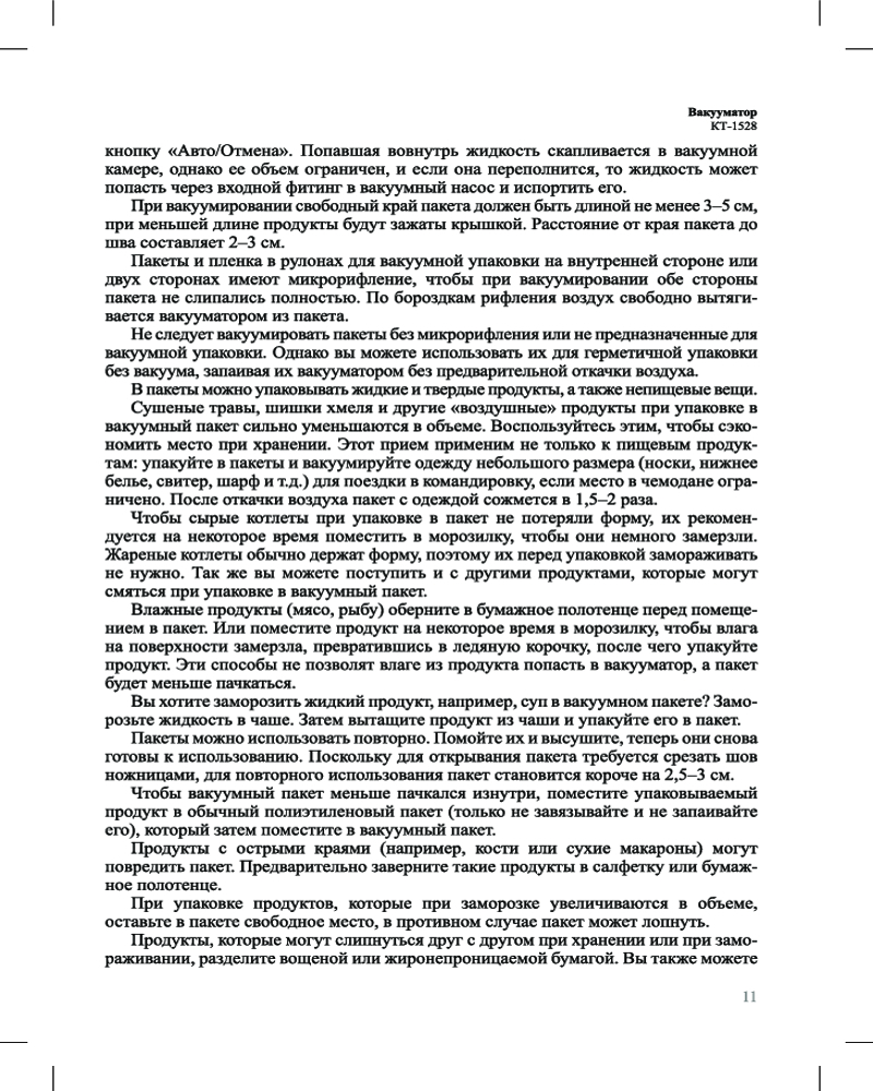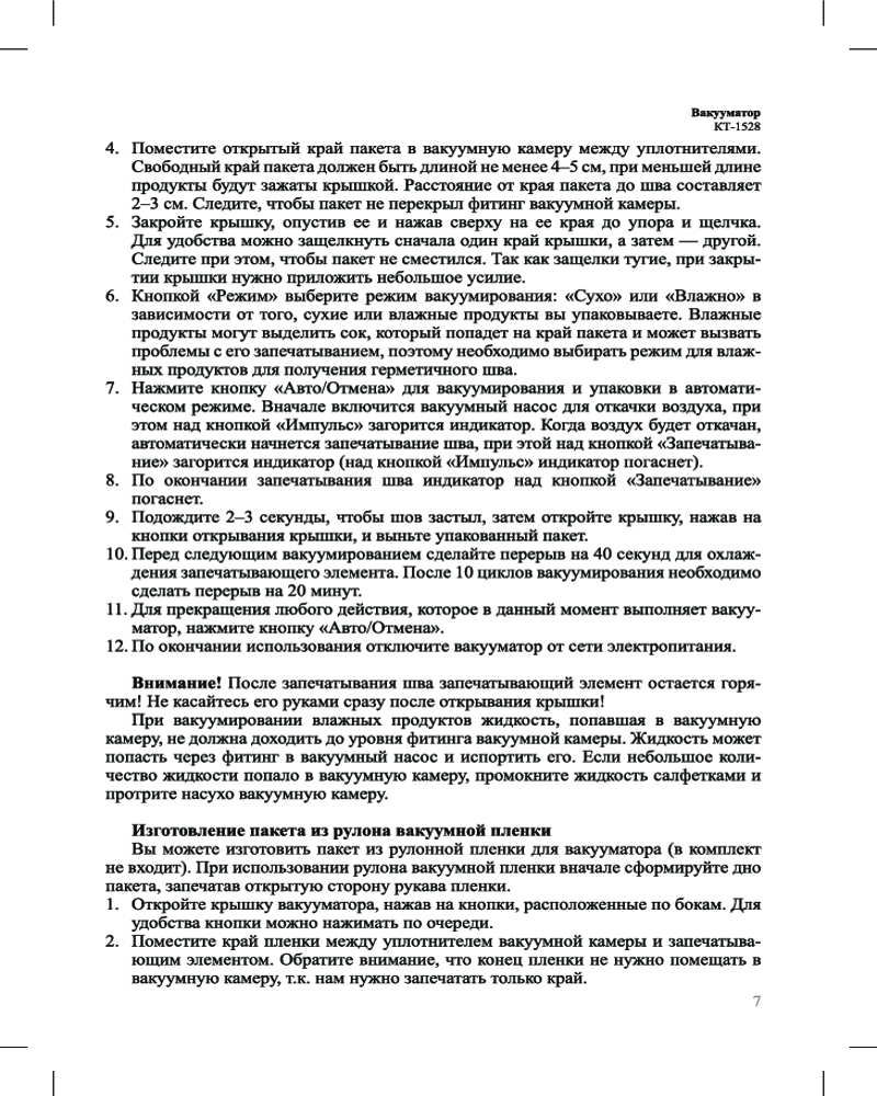 У КТ-1528 есть режимы для вакуумирования сухих и влажных продуктов с различным временем запечатывания. Влажные продукты могут намочить край пакета, поэтому время увеличено. Для надёжности можно запечатать пакет одинарным или двойным швом.