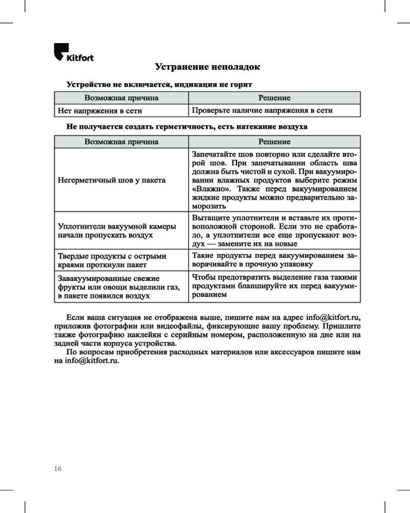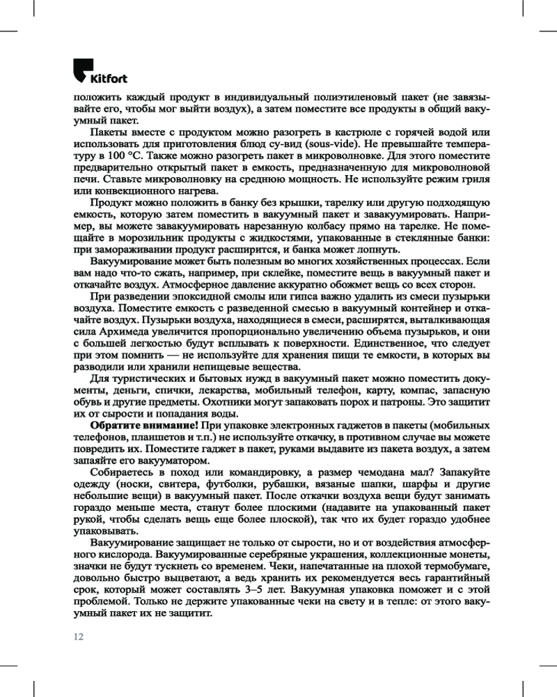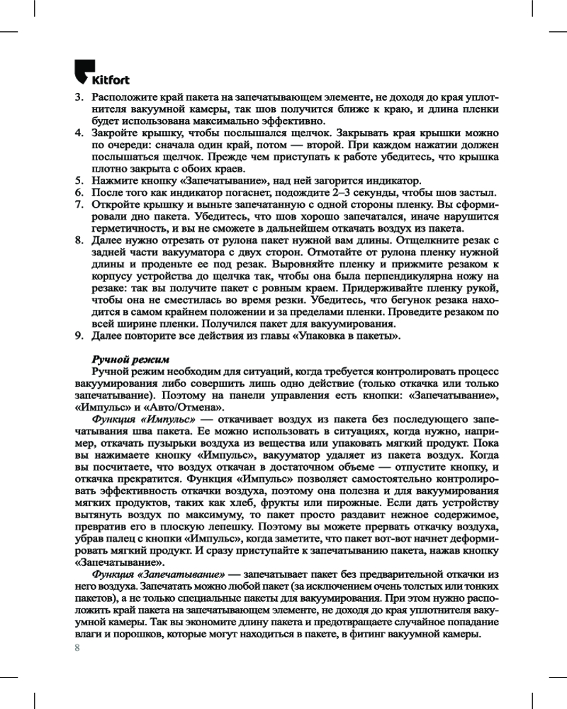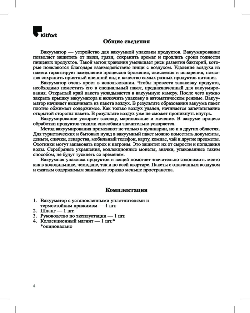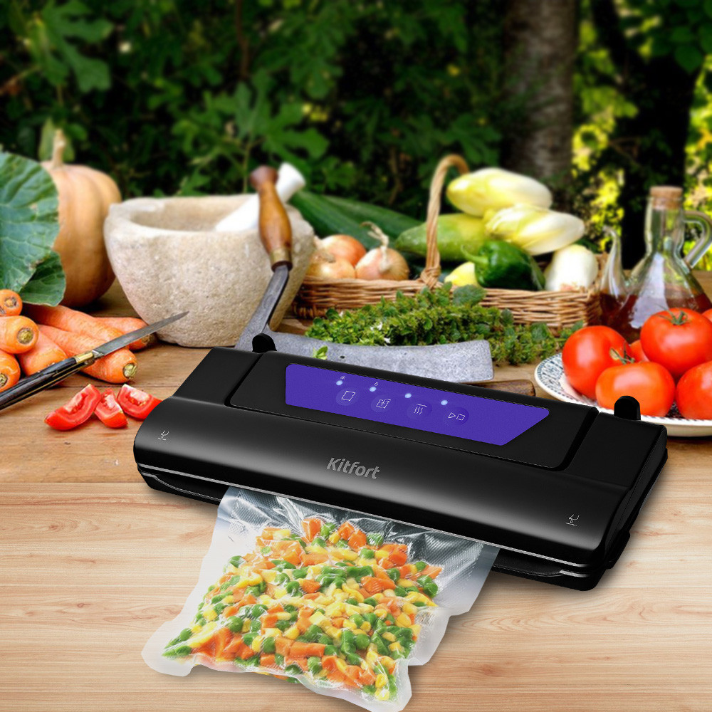 Вакууматор Kitfort КТ-1528 — современный прибор, призванный увеличить сроки хранения пищевых продуктов. Продукты, упакованные под вакуумом, сохраняют свежесть и не портятся существенно дольше по сравнению с обычными условиями хранения.