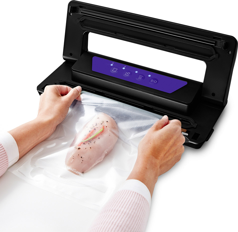 Открытый край пакета укладывается под крышку прибора, после чего вакууматор начинает выкачивать из него воздух. В результате образования вакуума пакет плотно обжимает содержимое. Как только воздух удалён, начинается запечатка открытой стороны пакета.