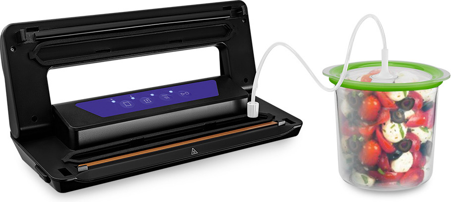 У устройства можно активировать режим откачки воздуха из контейнеров. Вакуумирование происходит при помощи шланга, вставленного в фитинг вакууматора одним концом, а другим в фитинг крышки контейнера.