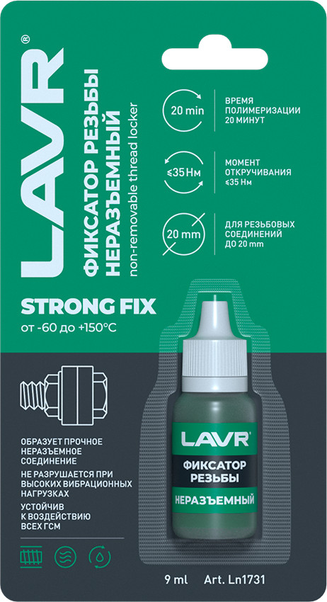 Состав герметизирует и фиксирует резьбовые соединения, требующие демонтажа только в случае капитального ремонта. Препятствует саморазвинчиванию деталей при вибрационных и ударных нагрузках. Быстро полимеризуется, устойчив к воздействию технических жидкостей. Применяется на любых резьбовых соединениях из черных металлов.