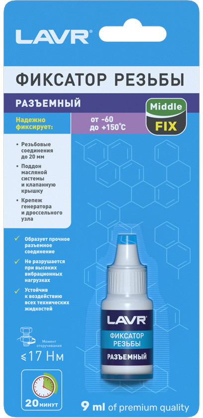 Состав герметизирует и фиксирует резьбовые соединения, требующие периодического демонтажа при сервисном обслуживании. Препятствует саморазвинчиванию деталей при вибрационных и ударных нагрузках. Быстро полимеризуется, устойчив к воздействию технических жидкостей. Применяется на любых резьбовых соединениях из черных металлов.