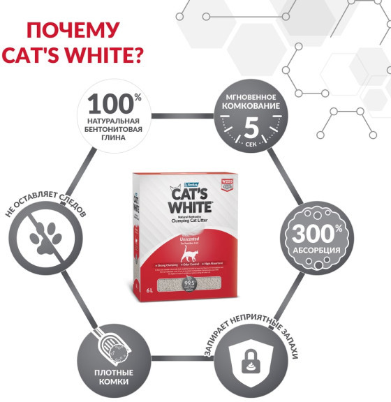 Наполнители «Cat’s White» создают гигиеничную среду благодаря превосходному комкованию за 5 секунд. Высокая абсорбирующая способность до 300% и мгновенное образование плотного комка за 5 секунд позволяют не только быстро и надежно запирать неприятные запахи, но и сохранять наполнитель чистым. Плотные комки надежно удерживают влагу, не крошатся и легко удаляются из лотка, поэтому полная замена наполнителя не требуется. Благодаря этому «Cat’s White» удобен и экономичен. На 99,5% очищен от пыли, не оставляет следов в доме и безопасен для кошек и их владельцев.