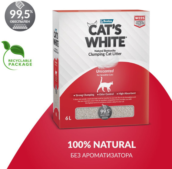 «Cat’s White» — премиальные комкующиеся наполнители из 100% натуральной бентонитовой глины. Монтмориллонит в структуре глины полностью нейтрализует неприятные запахи. «Cat’s White Natural» — это 100% натуральный наполнитель для кошачьего туалета. Не содержит ароматизаторов, что делает возможным использование наполнителя чувствительным к ароматам кошкам и владельцам.
