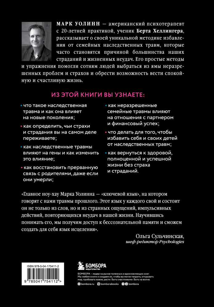 💳 Оплатить за товар можно при получении 🇰🇿 Есть бесплатная доставка по Казахстану от 1 дня 🎁 Копите бонусы с каждой покупки Серия: Подарочные издания. Бестселлеры по психологии в большом формате Депрессия, тревога, страхи, хронические боли, навязчивые мысли, которые отравляют нам жизнь... Помните ли, когда впервые столкнулись с ними? Возможно, что-то подобное переживали наши родители или дальние родственники? Каждый ребенок подсознательно несет отпечаток привычек и установок своих родных. Фрагменты их жизненного опыта, воспоминания, ощущения, переживания продолжают жить в нас, требуя своих решений. Ведущий специалист по работе с психологической травмой Марк Уолинн предлагает техники, которые помогут соединить в целое отдельные эмоции и события прошлого, тревожащие нас сегодня. Изучите сценарии, которые передаются в семье из поколения в поколение, и начните новую осознанную и счастливую жизнь. |