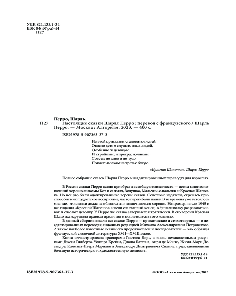 💳 Оплатить за товар можно при получении 🇰🇿 Есть бесплатная доставка по Казахстану от 1 дня 🎁 Копите бонусы с каждой покупки Серия: Подарочные издания. Иллюстрированная классика В России сказки Перро давно приобрели всеобщую известность — детям многих поколений хорошо знакомы Кот в сапогах, Золушка, Мальчик-с-пальчик и Красная Шапочка. Но всё это были адаптированные версии сказок. Советские издатели, стремясь приспособить их под детское восприятие, часто перегибали палку. В те времена уже устоялось мнение, что сказки должны обязательно заканчиваться хорошо. Например, после 1945 г. все издания «Красной Шапочки» имели счастливый конец: в финале волку разрезают живот и спасают девочку. У Перро же сказка завершается трагически. В его версии Красная Шапочка нарушила правила приличия и поплатилась за это жизнью. |