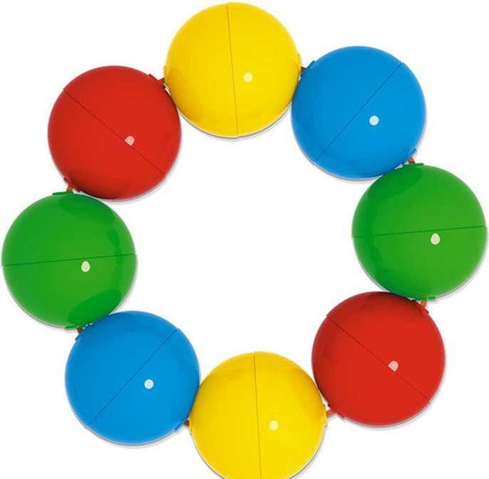 Нам досталась игрушка с одноцветными шариками. На картинке из половинок смотрится лучше, гремит тихо.