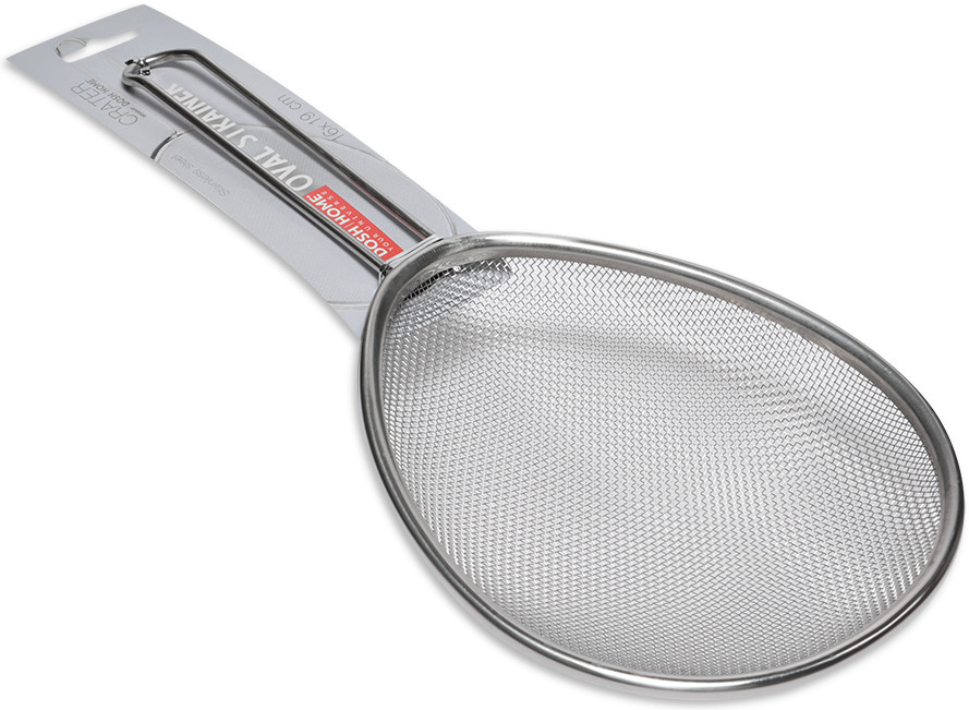 Длина ручки 13,5 см, длина самого сита 19 см, ширина 16 см. Сетка не сильно мелкая, средняя. Подойдет при жарке любых продуктов.
