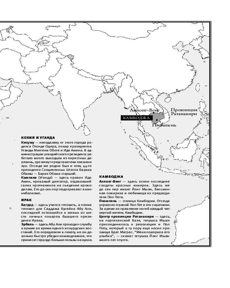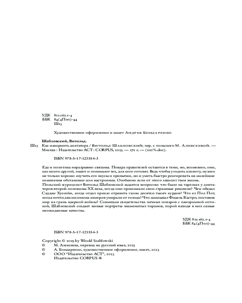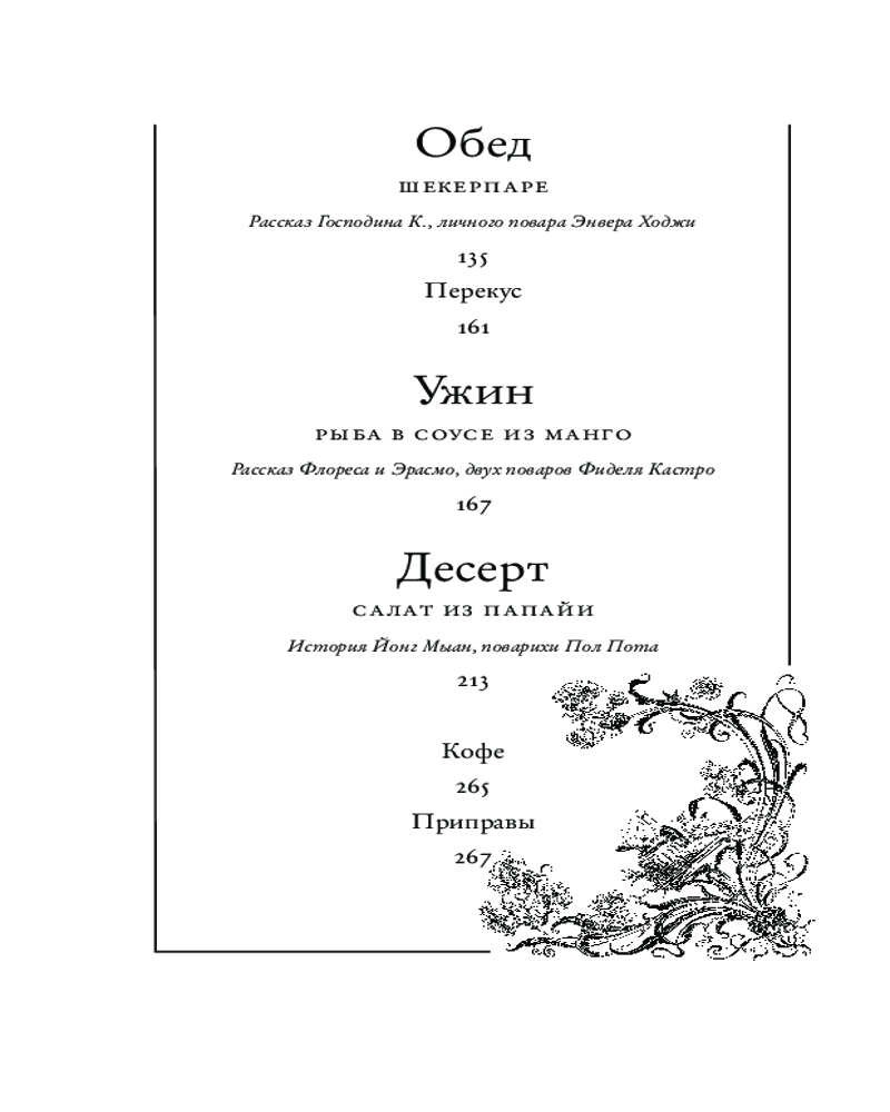 Польский журналист Витольд Шабловский задается вопросом: что было на тарелках у диктаторов второй половины ХХ века, когда они принимали свои страшные решения? Чем обедал Саддам Хуссейн, когда отдал приказ отравить газом десятки тысяч курдов? Что ел Пол Пот, когда почти два миллиона кхмеров умирали от голода? Что заказывал Фидель Кастро, поставив мир на грань ядерной войны? Совмещая свидетельства личных поваров с панорамной оптикой, Шабловский создает живые портреты знаменитых тиранов, порой находя в них самые неожиданные качества. |