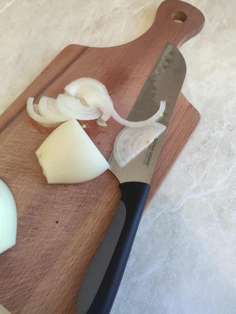 Очень очень понравился. Наточенный. Как получила сразу пришла домой и стала проверять как он в деле. Лук режет очень тонко. Острый нож. Лёгкий. Советую вам в приобретении товара