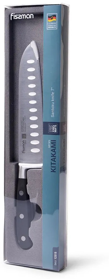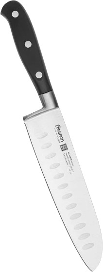 Нож-сантоку предназначен для шинковки овощей, тонкой нарезки, разделки мяса и рыбы. Углубления на поверхности лезвия облегчают использование: в них при нарезке остается воздух, поэтому продукты не налипают на лезвие. Чтобы продлить срок службы ножа, его следует мыть вручную.