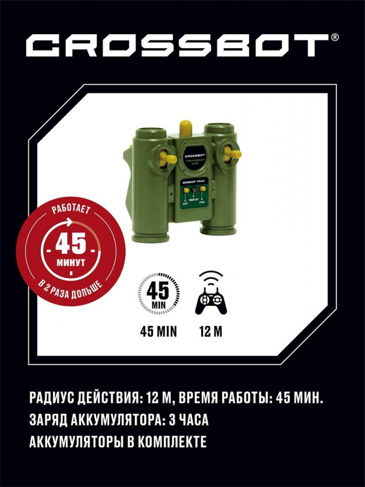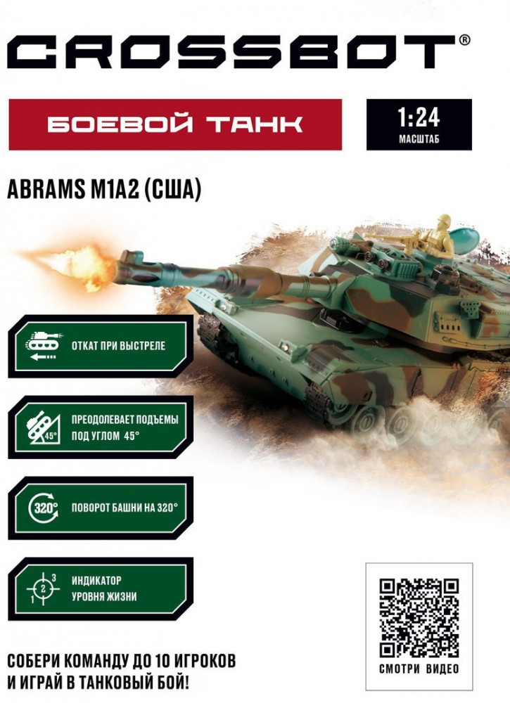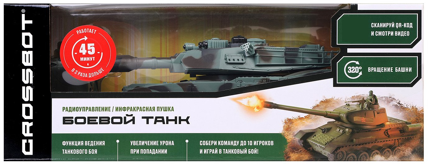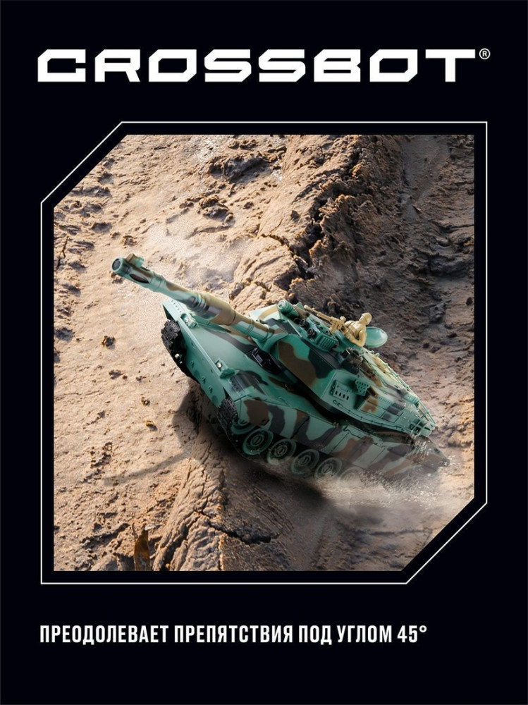 Crossbot Танк на радиоуправлении «Abrams M1A2»В данный момент этот товар отсутствует в продаже. Возможно, у нас найдется аналогичный или похожий товар здесь. Радиоуправляемая модель танка Abrams M1A2 (США) с реалистичными светозвуковыми эффектами при стрельбе и визуальными эффектами (отдача при выстреле). Танк осуществляет движение вперёд/назад, повороты вправо/влево, подъёмы под углом 45°, круговое вращение на месте и поворот башни вправо/влево на 320°. В игрушке предусмотрены демонстрационный режим и автоотключение. Танк оснащён функцией боя. |