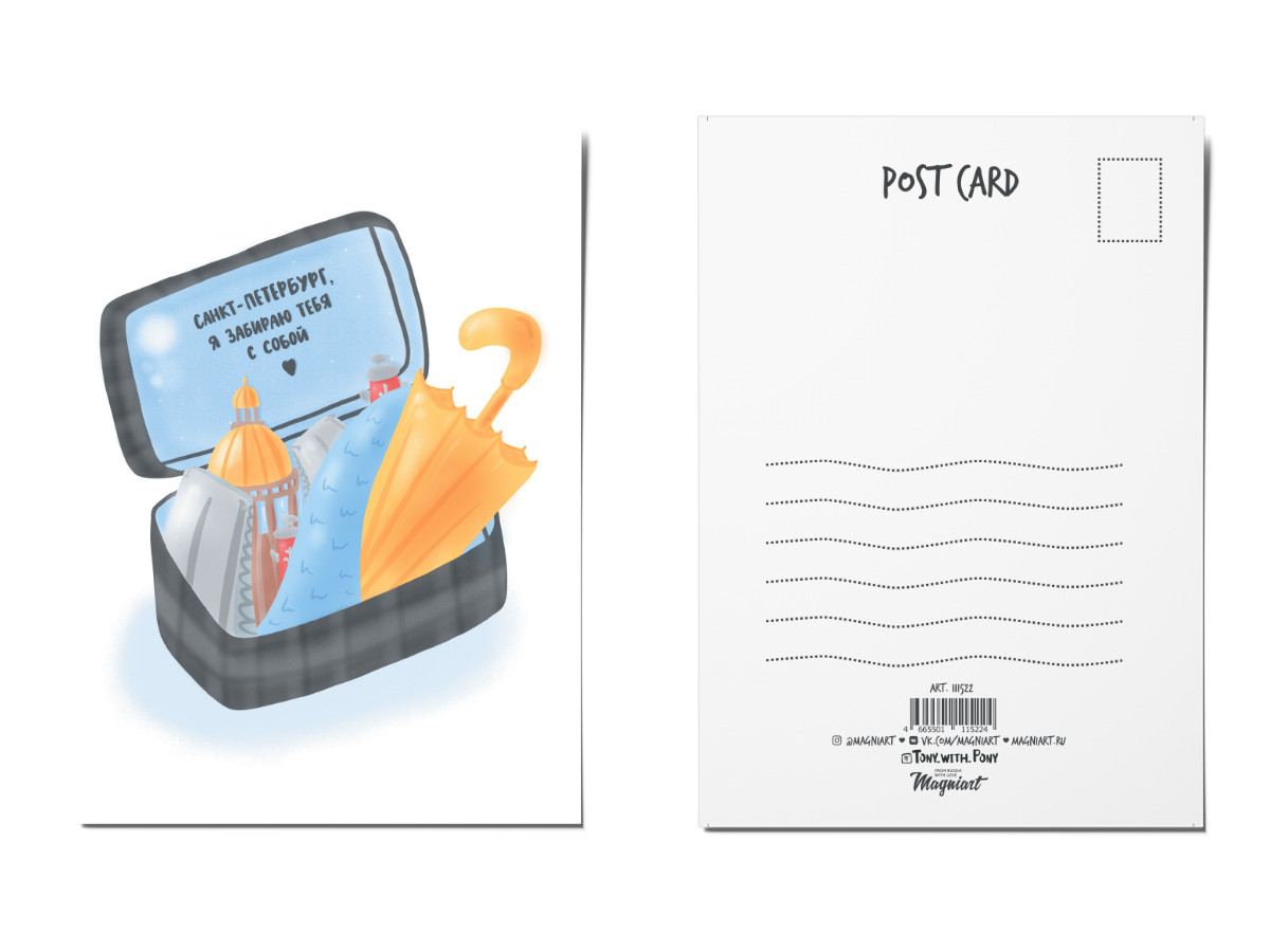 MagniArt Открытка почтовая «Забираю с собой»В данный момент этот товар отсутствует в продаже. Возможно, у нас найдется аналогичный или похожий товар здесь. На обратной стороне присутствует место для оформления отправления, наклеивания марки и пары строк от отправителя. Открытка напечатана на дизайнерской бумаге с приятной на ощупь структурой. |