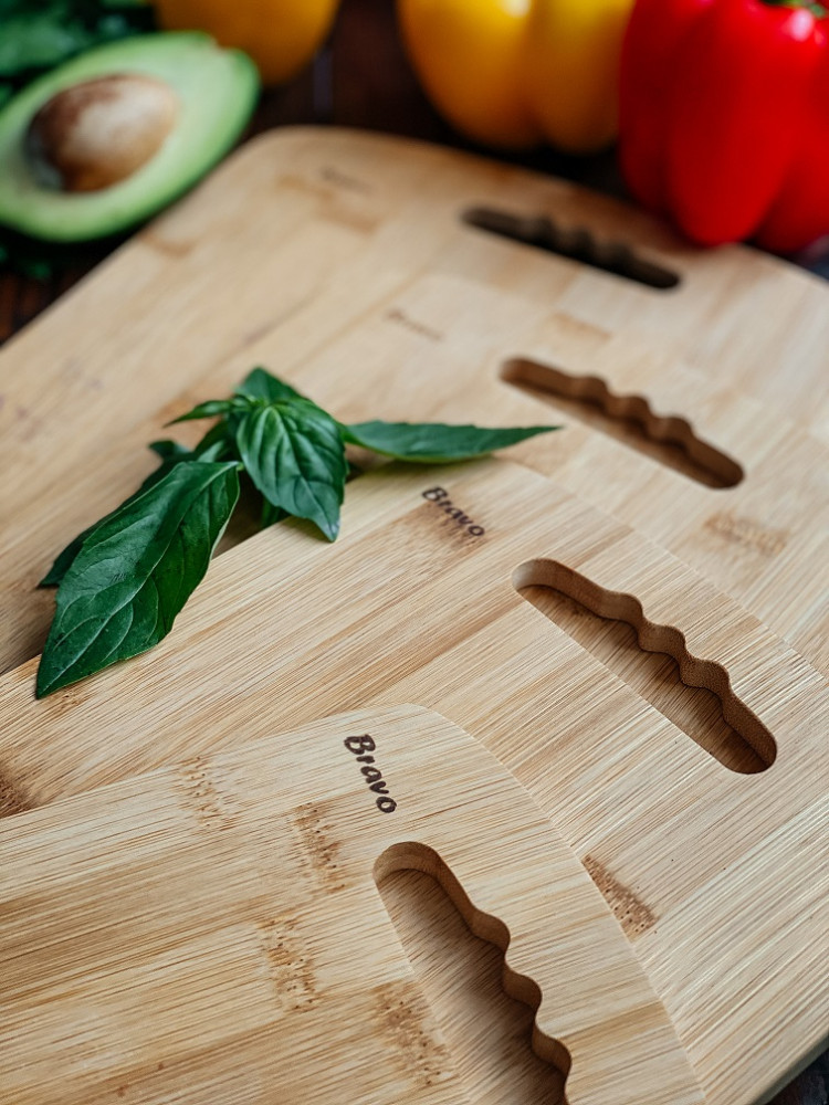 У разделочной доски имеется вырезная ручка, она удобна для переноски и хранения. Бамбук считается экологичным, антисептическим, гигиеничным, долговечным и не впитывающим влагу материалом, поэтому разделочная доска из бамбука отлично подойдет для обработки и нарезки мяса, рыбы, хлебобулочных изделий, овощей, зелени и прочих продуктов. Доска устойчива к механическим нагрузкам и не тупит нож. Кроме того, разделочная доска из бамбука отлично впишется в интерьер любой кухни.
