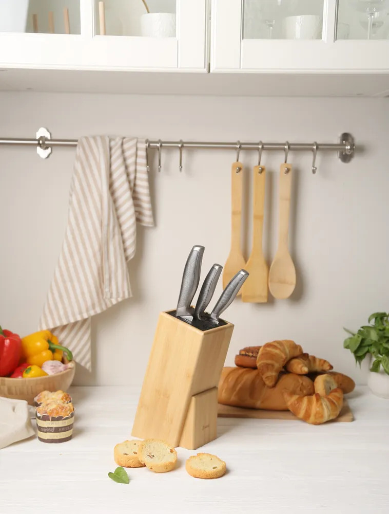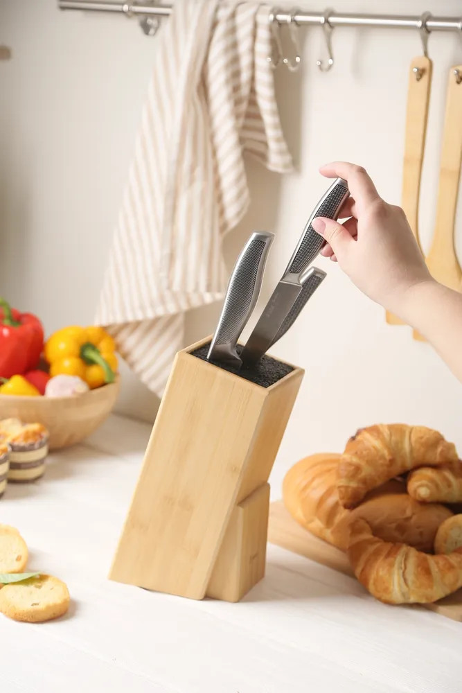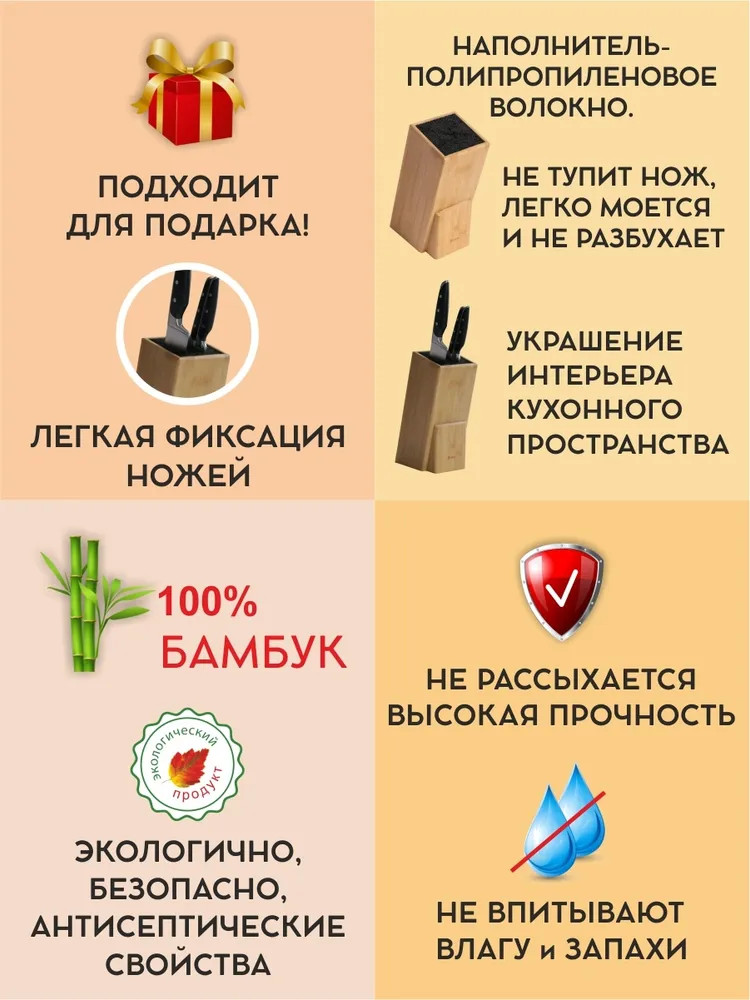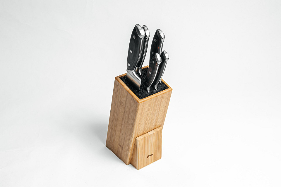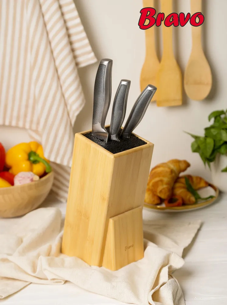 Bravo Подставка для ножейВ данный момент этот товар отсутствует в продаже. Возможно, у нас найдется аналогичный или похожий товар здесь. Деревянная подставка для ножей подходит для безопасного хранения ножей и ножниц любой формы. Благодаря гибким волокнам, ножи можно вставлять под любым углом, при этом не повредив их острый режущий край.Наполнитель можно достать из емкости и промыть при загрязнении. Конструкция отличается устойчивостью. Подставка выполнена из бамбука, а он считается экологичным, антисептическим, гигиеничным и долговечным материалом. |
