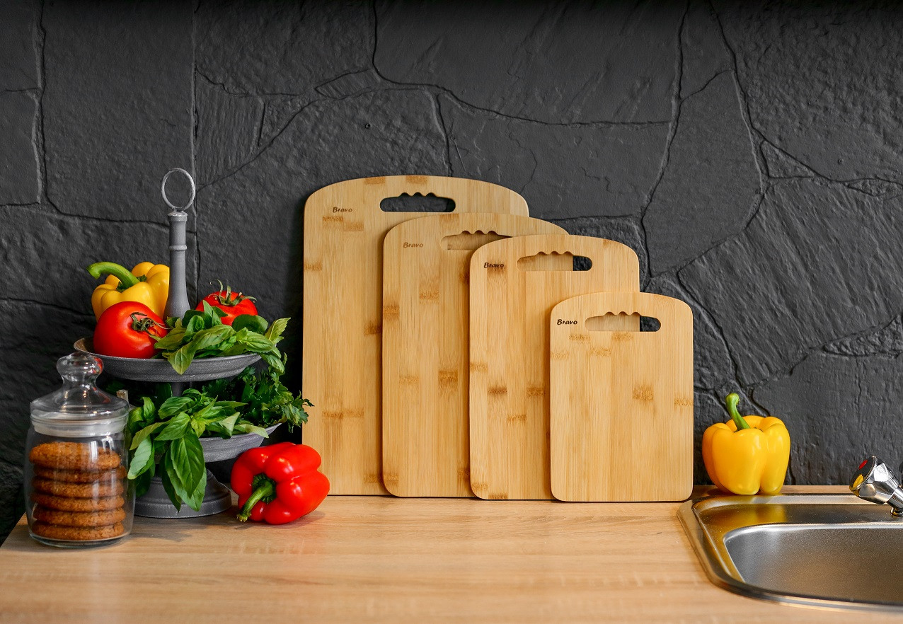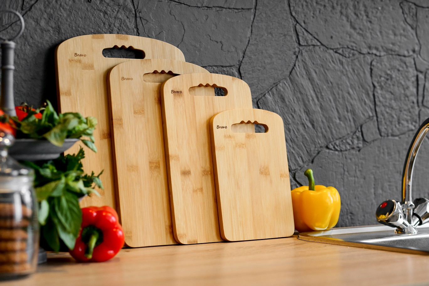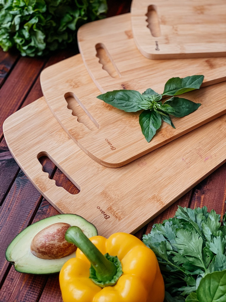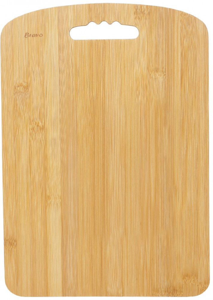 У разделочной доски имеется вырезная ручка, она удобна для переноски и хранения. Бамбук считается экологичным, антисептическим, гигиеничным, долговечным и не впитывающим влагу материалом, поэтому разделочная доска из бамбука отлично подойдет для обработки и нарезки мяса, рыбы, хлебобулочных изделий, овощей, зелени и прочих продуктов. Доска устойчива к механическим нагрузкам и не тупит нож. Кроме того, разделочная доска из бамбука отлично впишется в интерьер любой кухни.