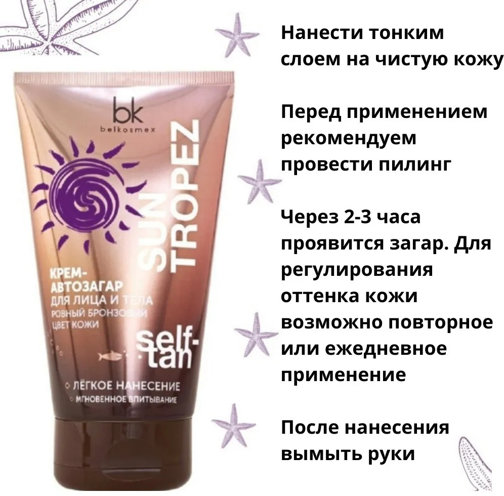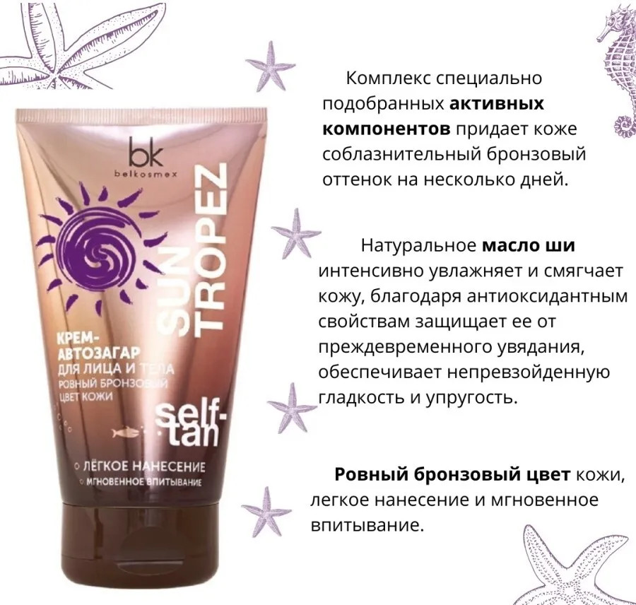 Belkosmex Крем-автозагар для лица и телаВ данный момент этот товар отсутствует в продаже. Возможно, у нас найдется аналогичный или похожий товар здесь. Крем-автозагар для лица и тела ровный бронзовый цвет кожи легкое нанесение мгновенное впитывание это комплекс специально подобранных активных компонентов придающие коже соблазнительный бронзовый оттенок на несколько дней. Натуральное масло ши интенсивно увлажняет и смягчает кожу, благодаря антиоксидантным свойствам защищает ее от преждевременного увядания, обеспечивает непревзойденную гладкость и упругость. |